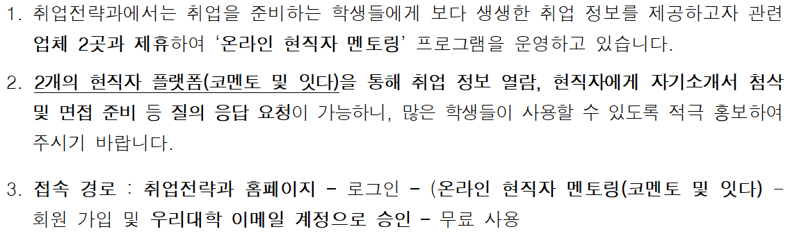 [취업정보] 온라인 현직자 멘토링 안내(자기소개서 첨삭 및 면접준비 등)