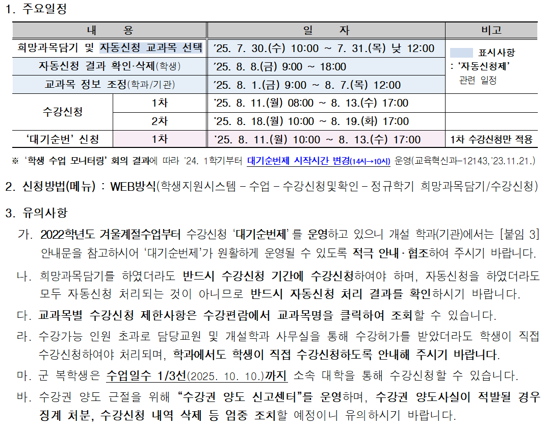 [학사일정] 2025학년도 2학기 학부 희망과목담기 및 수강신청(대기순번제) 안내