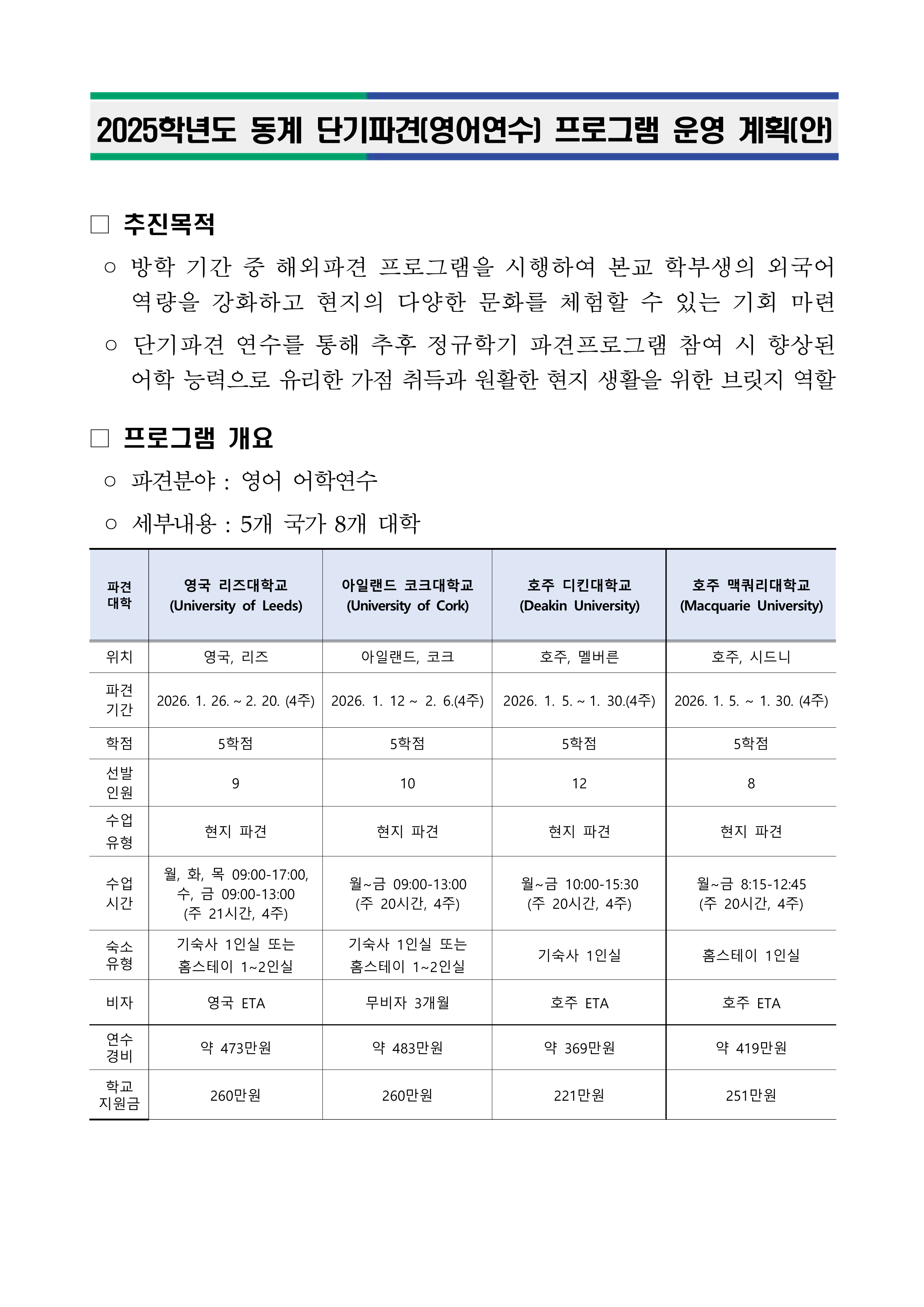 2025학년도 동계 단기파견(영어연수)을 다음과 같이 운영하오니, 관심있는 학생들의 많은 참여 바랍니다.