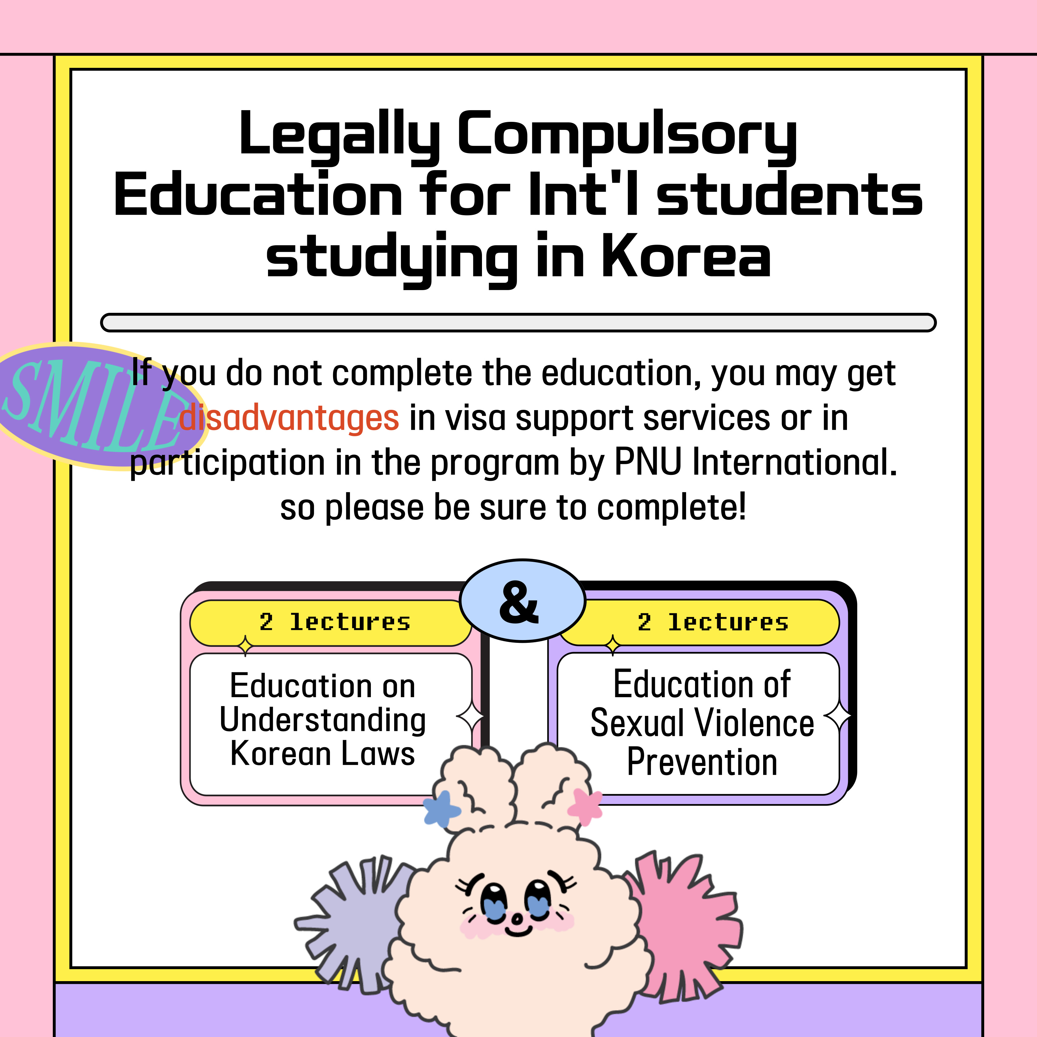 ◈ Please be sure to take education, since if you do not complete the education, you may get disadvantages in visa support services(including group visa extension) or in participation in the program by PNU International such as cultural experience, dormitory admission, etc.