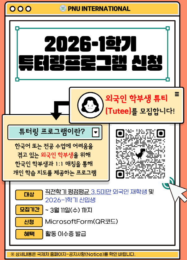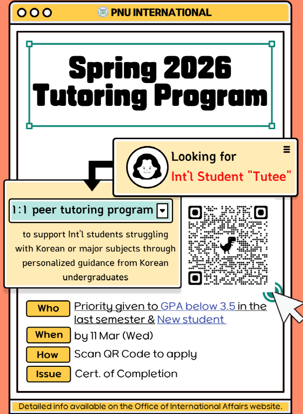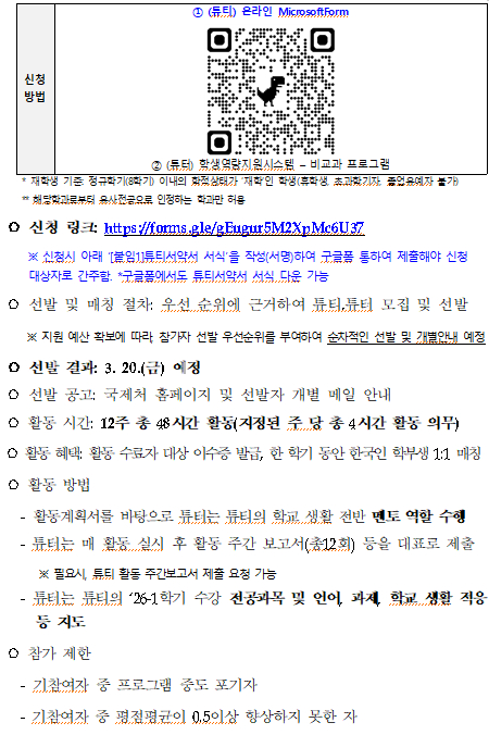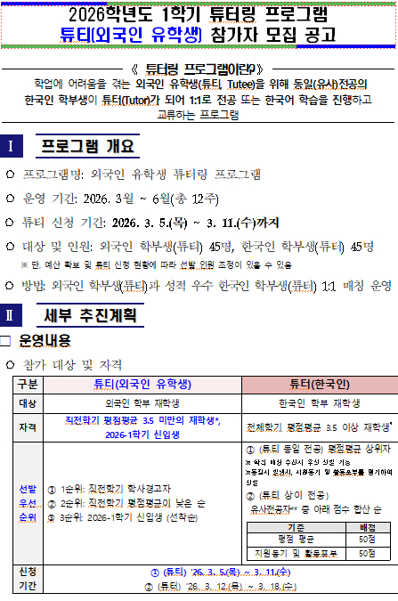 [교내활동] 2026학년도 1학기 튜터링 프로그램 튜티(외국인 학부생) 모집 공고