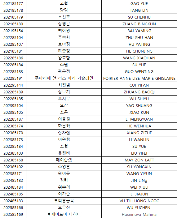* 현재까지 외국인공통 한국어 교과목 이수 면제 신청 완료자명단