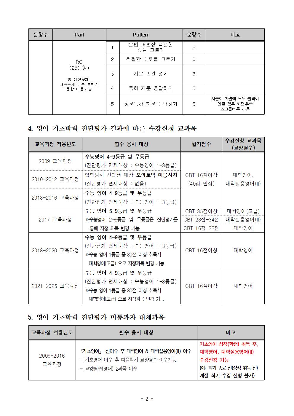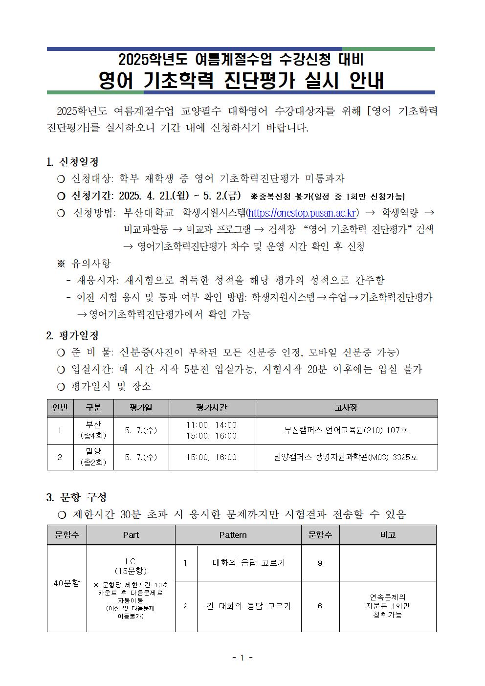 2025학년도 여름계절수업 수강신청 대비 영어 기초학력 진단평가 실시 안내