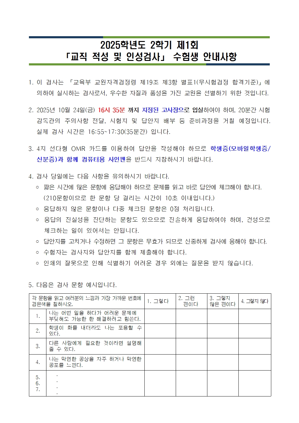2025학년도 2학기 제1회 [교직 적성 및 인성 검사] 수험생 안내사항.hwp