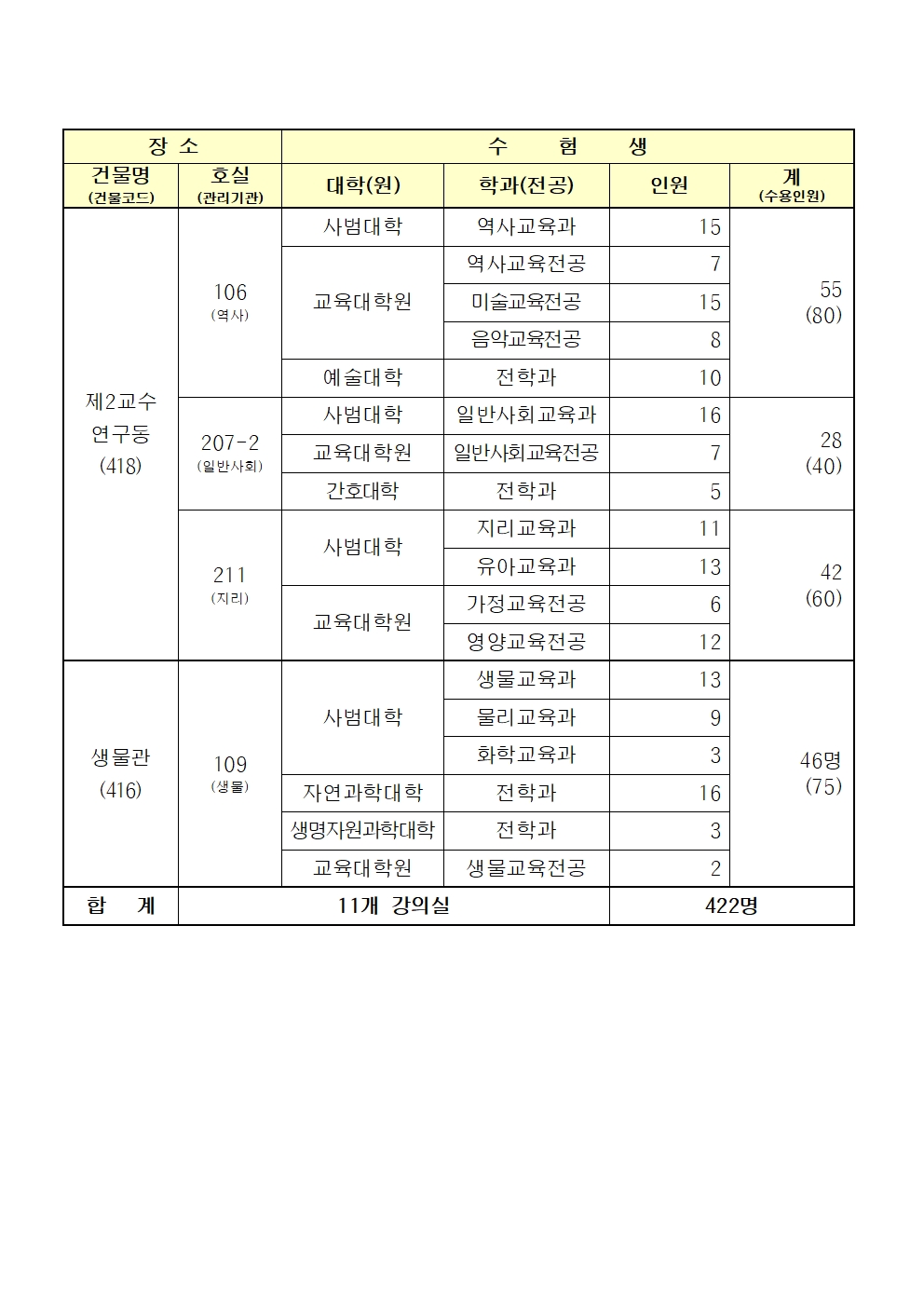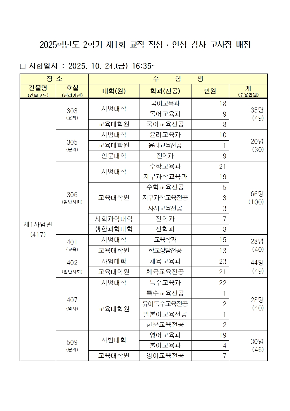 2025학년도 2학기 제1회 「교직 적성 및 인성 검사」 고사장 안내