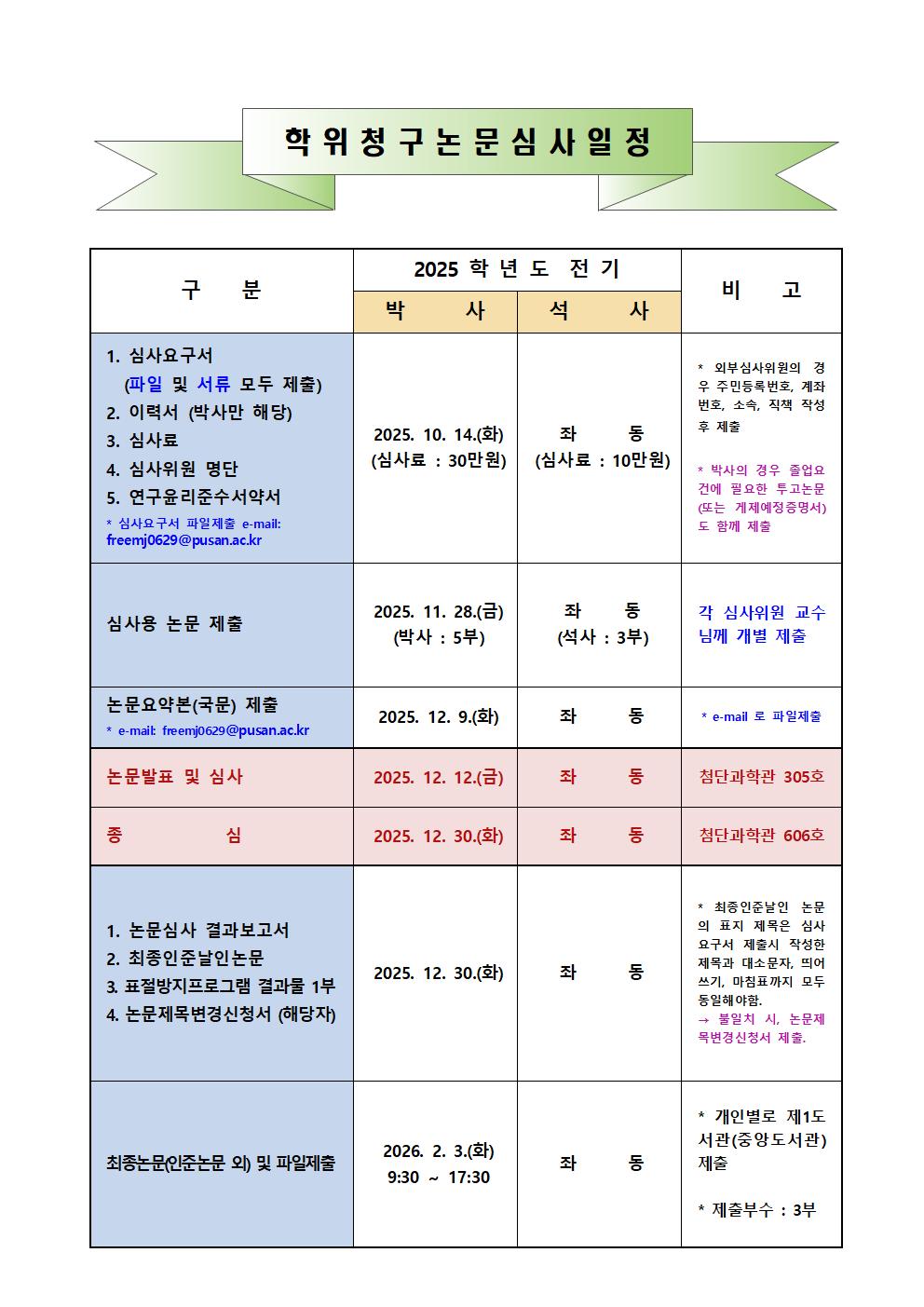 2025학년도 전기(2025학년도 2학기) 학위청구 심사계획을 붙임과 같이 알립니다.