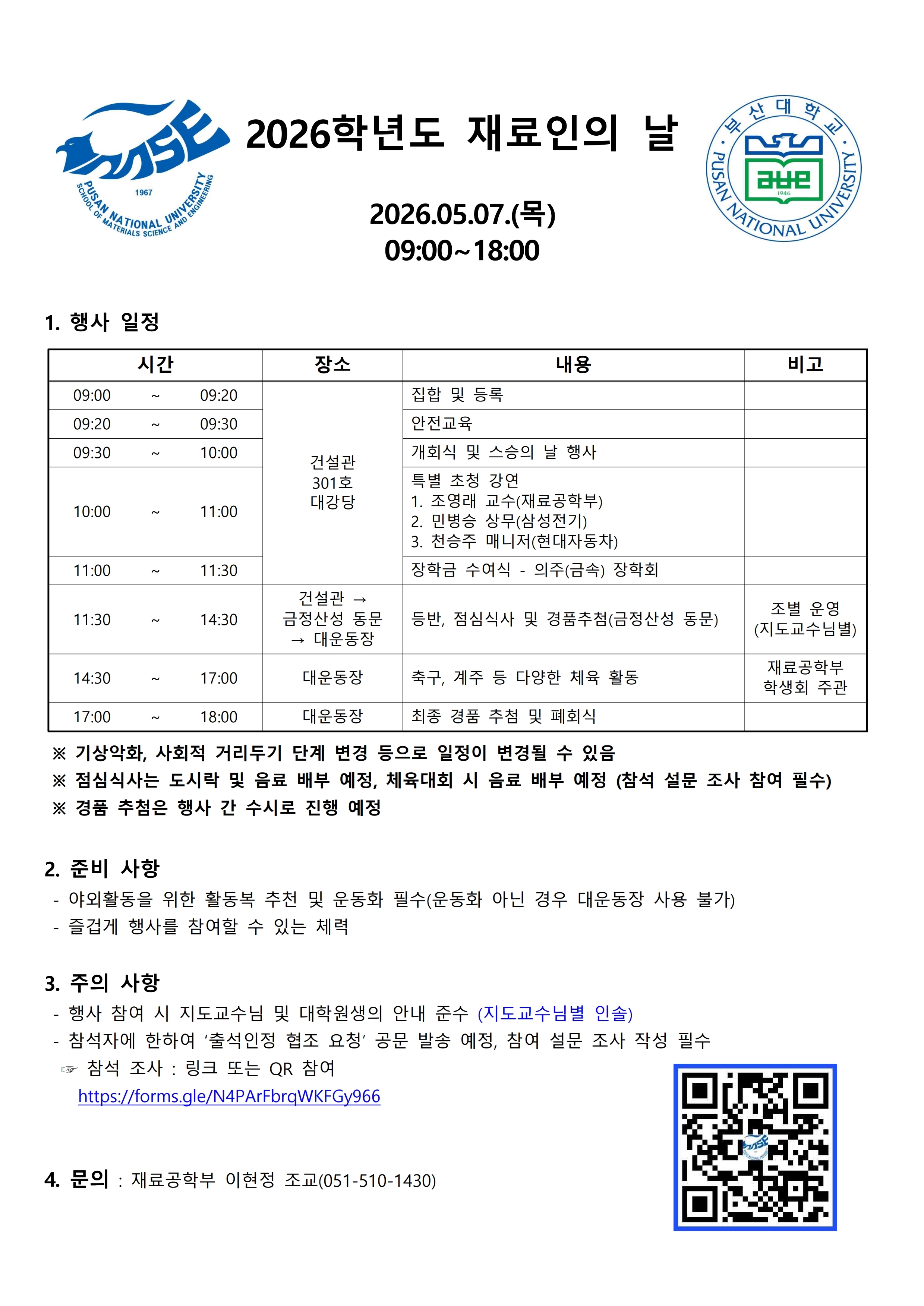 재료공학부에서는 재료인의 역량을 강화하고, 스승과 제자, 선후배 및 동기간의 소통과 단합을 통해 협동심과 소속감을 함양하고자 「2026학년도 재료인의 날」 행사를 다음과 같이 개최합니다.