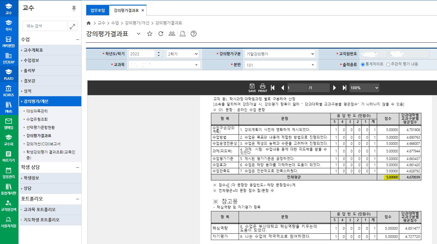 부산대학교 교육정보시스템 (https://one.pusan.ac.kr/) - 수업 - 강의평가/개선 - 강의평가 결과표 - 2025학년도 1학기로 설정 후 "기말강의평가" 교과목별 조회 - 평균점수 확인