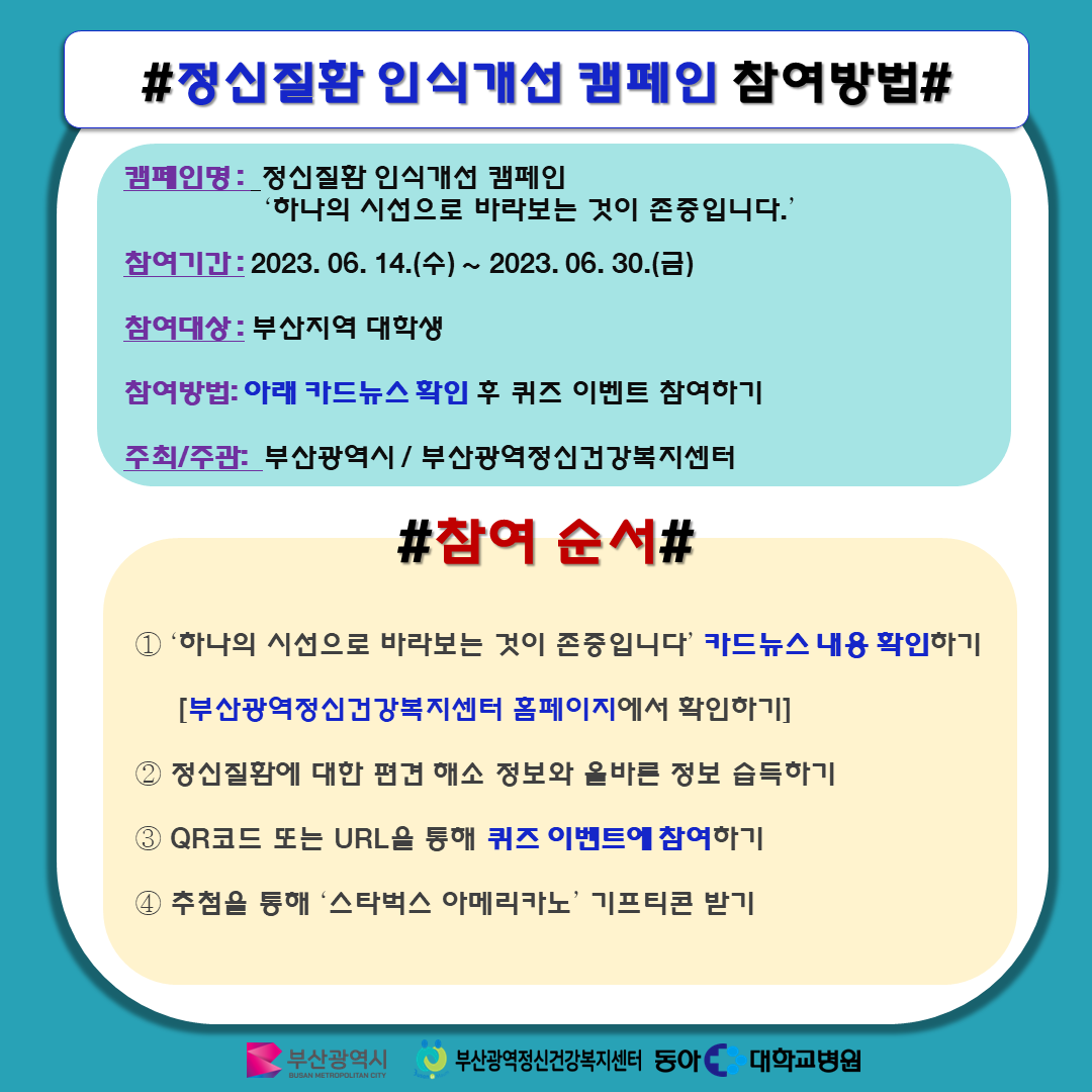방법: 부산광역정신건강복지센터 홈페이지의 카드뉴스 확인 후 URL/QR코드를 통해 퀴즈 이벤트 참여하기