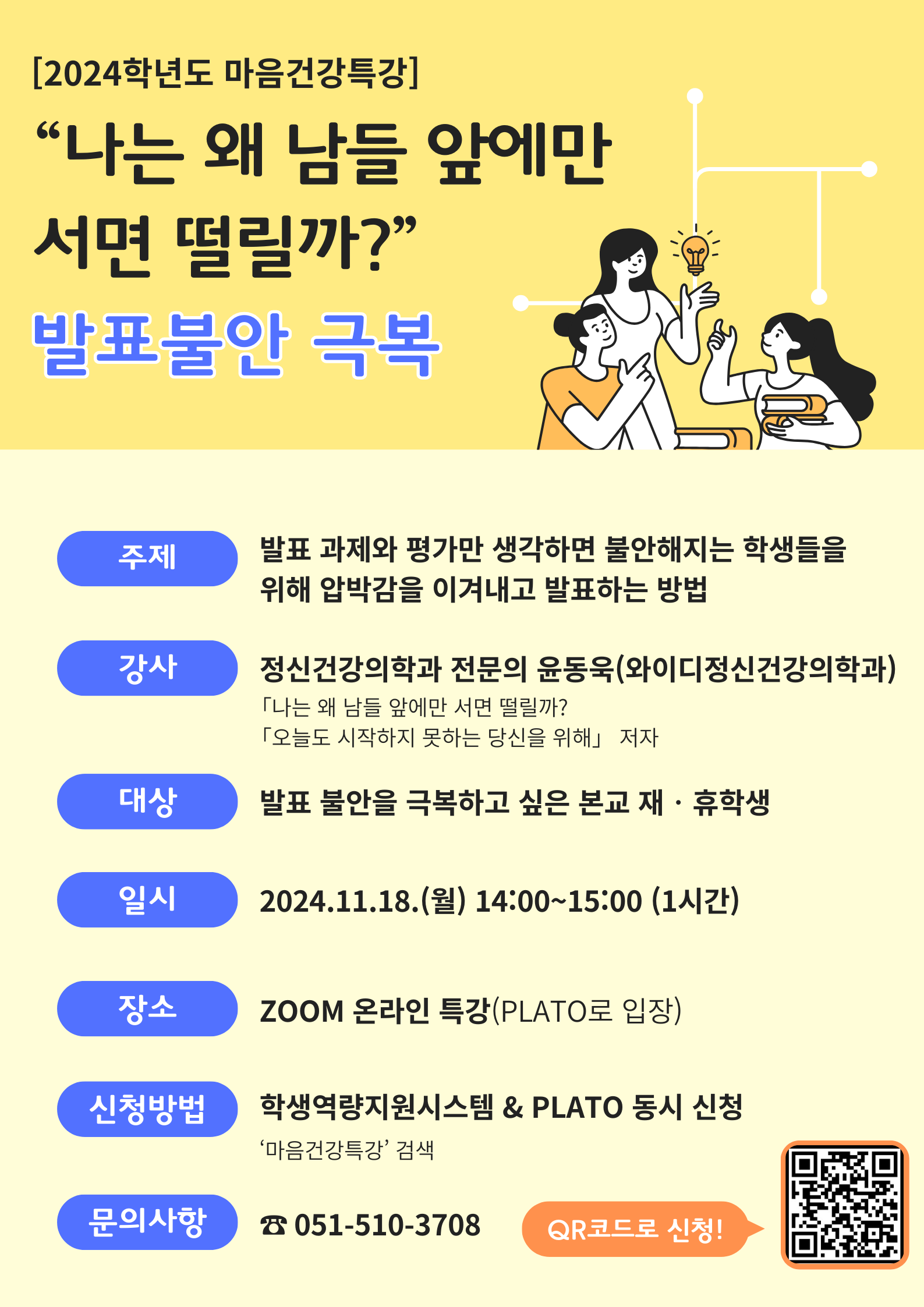 - 신청방법: 학생역량지원시스템 - 비교과 프로그램 -'마음건강특강' 검색 후 신청(QR코드 활용)