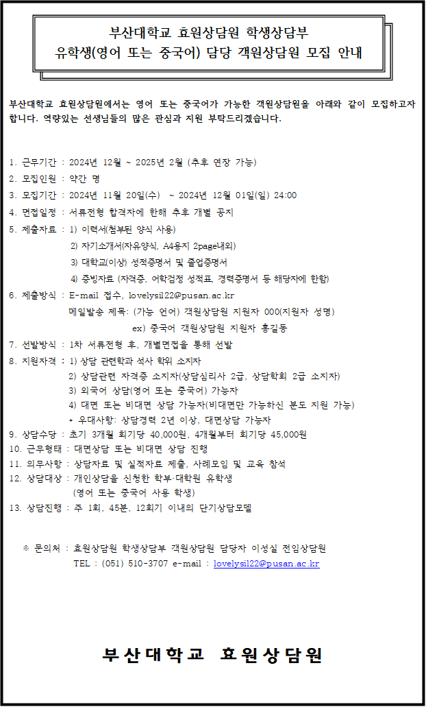 [효원상담원] 유학생(영어 또는 중국어) 담당 객원상담원 모집 안내