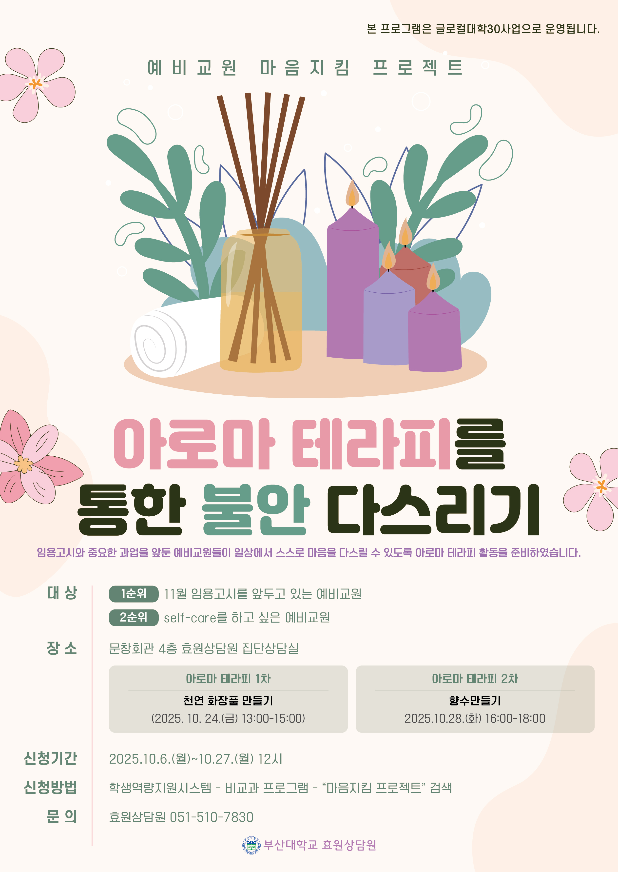 효원상담원에서는 11월 임용고시 등 중요한 과업을 앞둔 예비교원들의 마음지킴을 위한 아로마 테라피를 준비하였습니다.