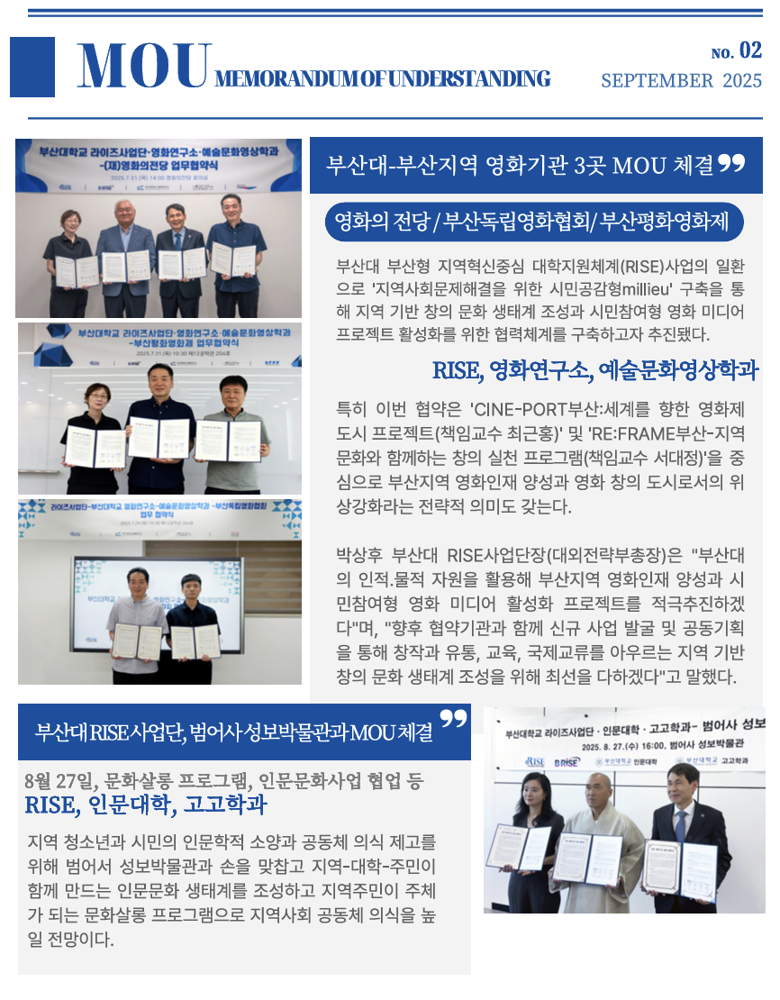 2025-09-30 부산대-부산지역 영화기관 3곳 및 부산대 RISE 사업단-범어사 성보박물관 MOU 체결, 부산대학교 영화연구소 및 예술문화영상학과 참여.