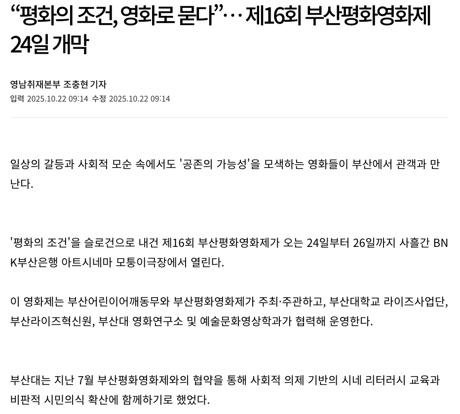 2025-10-22 '부산평화영화제', 24일 개막 부산대학교 라이즈 사업단, 영화연구소 및 예술문화영상학과 협력 운영
