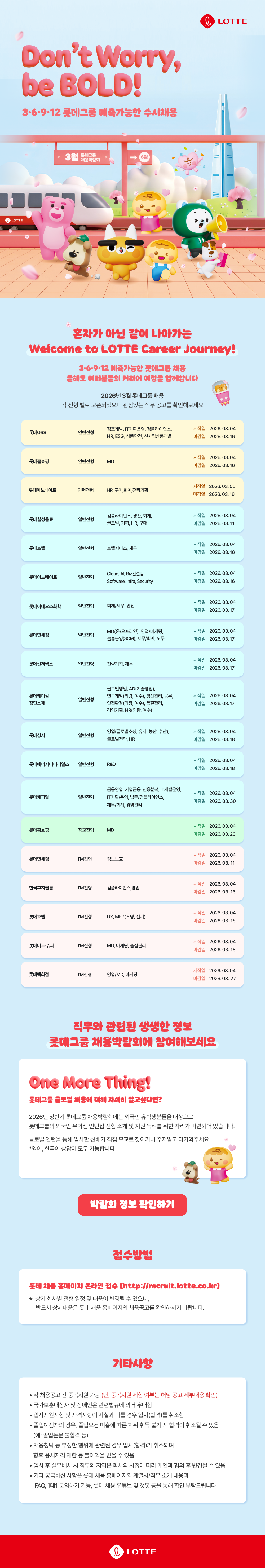 [롯데그룹] 3·6·9·12 예측가능한 롯데그룹 채용 '3월 공고 오픈' (3/4~) ■ 지원서 접수 - 접수 방법 : 롯데 채용 홈페이지 온라인 접수(?https://recruit.lotte.co.kr/) - 서류모집 기간 : 2026.03.04(수) ~ * 서류모집 기간의 경우, 계열사 별 상이하여 자세한 사항은 홈페이지 확인 바랍니다. ■ 모집 전형 - 인턴 전형 - 일반 전형 (장교전형 동일) - I'M 전형 ■ 모집 직무 - 영업/마케팅 - 지원/전략 - IT - 기술 - 연구개발 - 디자인 등 ■ 2026년 3월 롯데그룹 채용박람회 - 일시 : 2026년 3월 3일(화) ~ 3월 9일(월) - 진행 학교 : 서울대, 고려대, 한양대, 연세대, 서강대, 성균관대(자연), 이화여대 * 외국인 유학생분들도 참여하실 수 있는 글로벌 채용 부스와 함께 참가자분들을 위한 다양한 이벤트가 준비되어있으니 많은 관심 부탁드립니다. ※ 자세한 사항은 홈페이지를 확인해주세요! - 채용 홈페이지 : https://lotte-36912recruit.com/ |