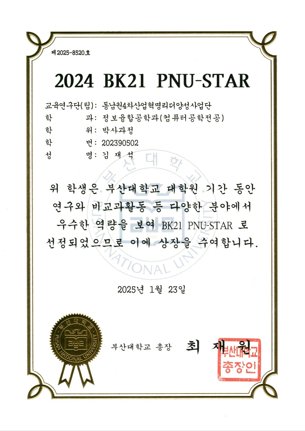 동남권4차산업혁명리더양성사업단에서 진행하는 대학원 혁신사업(BK21)의 '2024 BK21 PNU-STAR'로 김재석 박사과정 학생이 선정되었습니다.