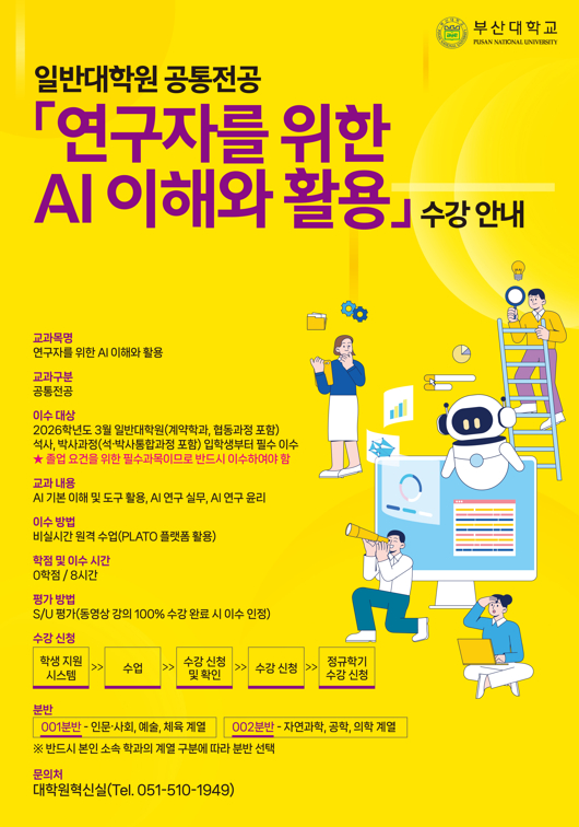 2026학년도 대학원 교육과정 전면 개편에 따라 2026학년도 1학기부터 매 학기 「연구자를 위한 AI 이해와 활용」교과목을 편성ㆍ운영합니다.