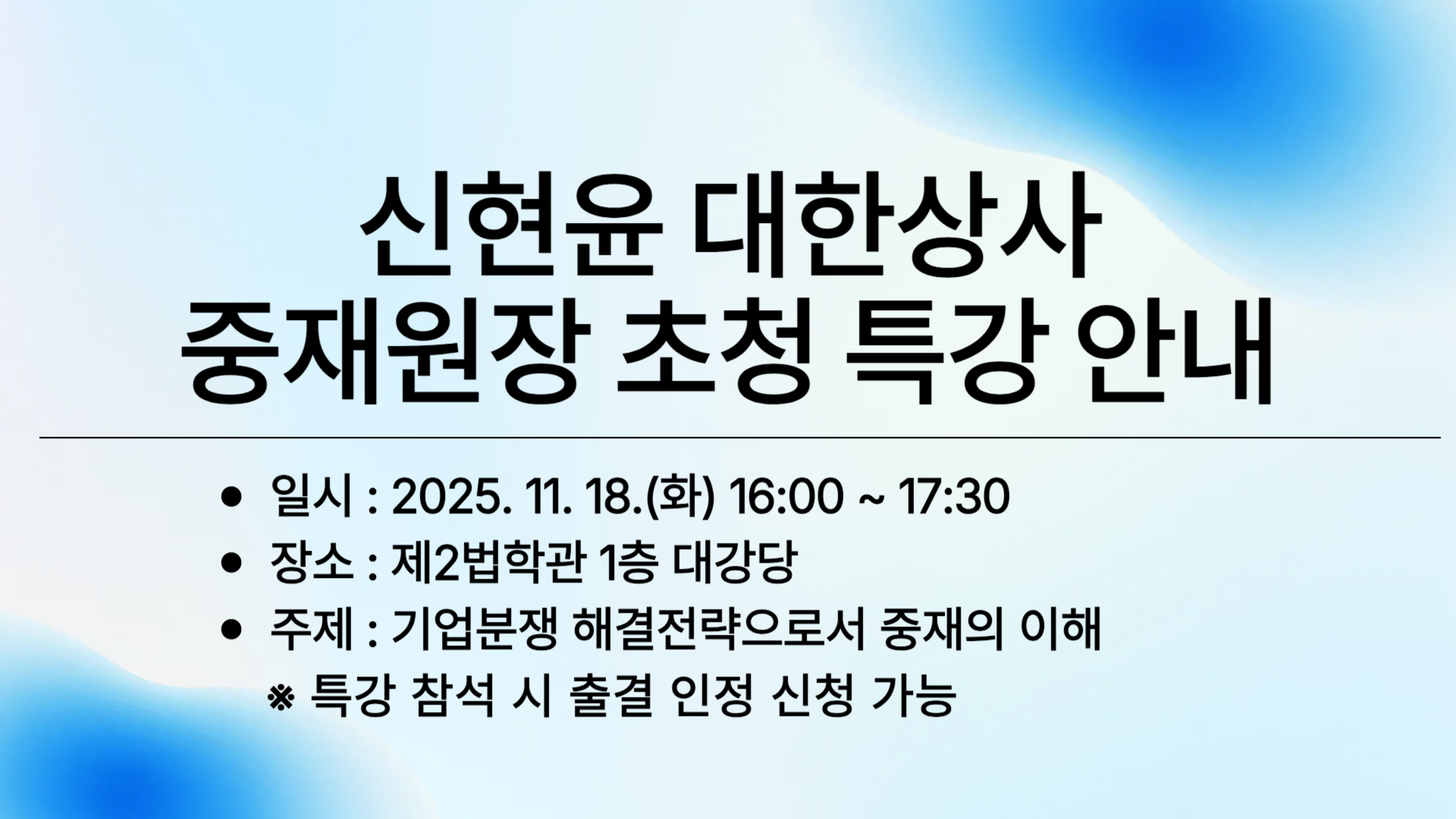fnctId=bbs,fnctNo=2557 작성일 2025.11.17 수정일 2025.11.17 작성자 박소진 조회수 65 [법전원] 대한상사중재원장 초청 특강 안내(11/18, 16시) 관심 있는 재학생 여러분의 많은 참여 바랍니다. 첨부파일 첨부파일이(가) 없습니다.