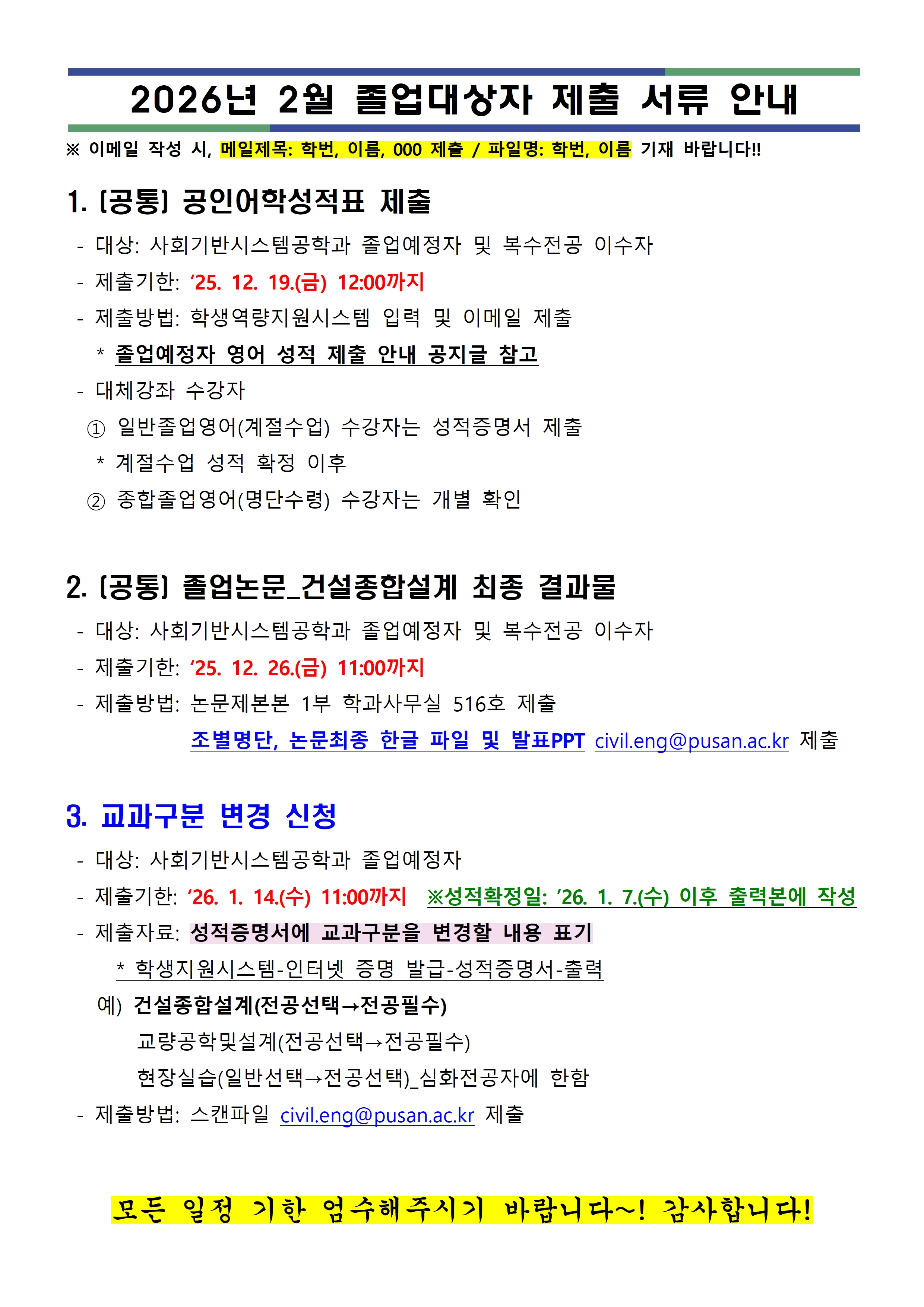 fnctId=bbs,fnctNo=3207 작성일 2025.10.31 수정일 2025.10.31 작성자 관리자 조회수 170 [2025학년도 2학기] 졸업대상자 제출서류 안내 첨부파일 교과구분 변경 샘플.pdf 미리보기 [조별명단] 2025-2학기 학부 졸업논문 정보_건설종합설계 최종 결과물.hwp 미리보기 논문작성지침및서식 별지제28호서식 1부 2025.hwp 미리보기