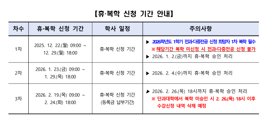 fnctId=bbs,fnctNo=3207 작성일 2025.12.17 수정일 2025.12.17 작성자 관리자 조회수 117 [2026학년도 1학기] 휴.복학 신청 기간 안내 2026학년도 1학기 휴학 및 복학 신청기간을 다음과 같이 안내드립니다.전과 및 융합전공 신청 등에 차질이 없도록 기한 내 신청해 주시기 바랍니다. 첨부파일 첨부파일이(가) 없습니다.