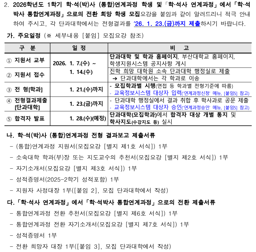 fnctId=bbs,fnctNo=3207 작성일 2025.12.18 수정일 2025.12.18 작성자 관리자 조회수 13 [2026학년도 1학기] (통합)연계과정 학생 및 전환 희망 학생 모집 안내 첨부파일 1.2026학년도 1학기 학.석(박)사 (통합)연계과정 및 전환 모집요강.hwp 미리보기 4.연계과정관련 질의응답.hwp 미리보기 6.부산대학교 연계과정 및 통합연계과정 운영지침.hwp 미리보기