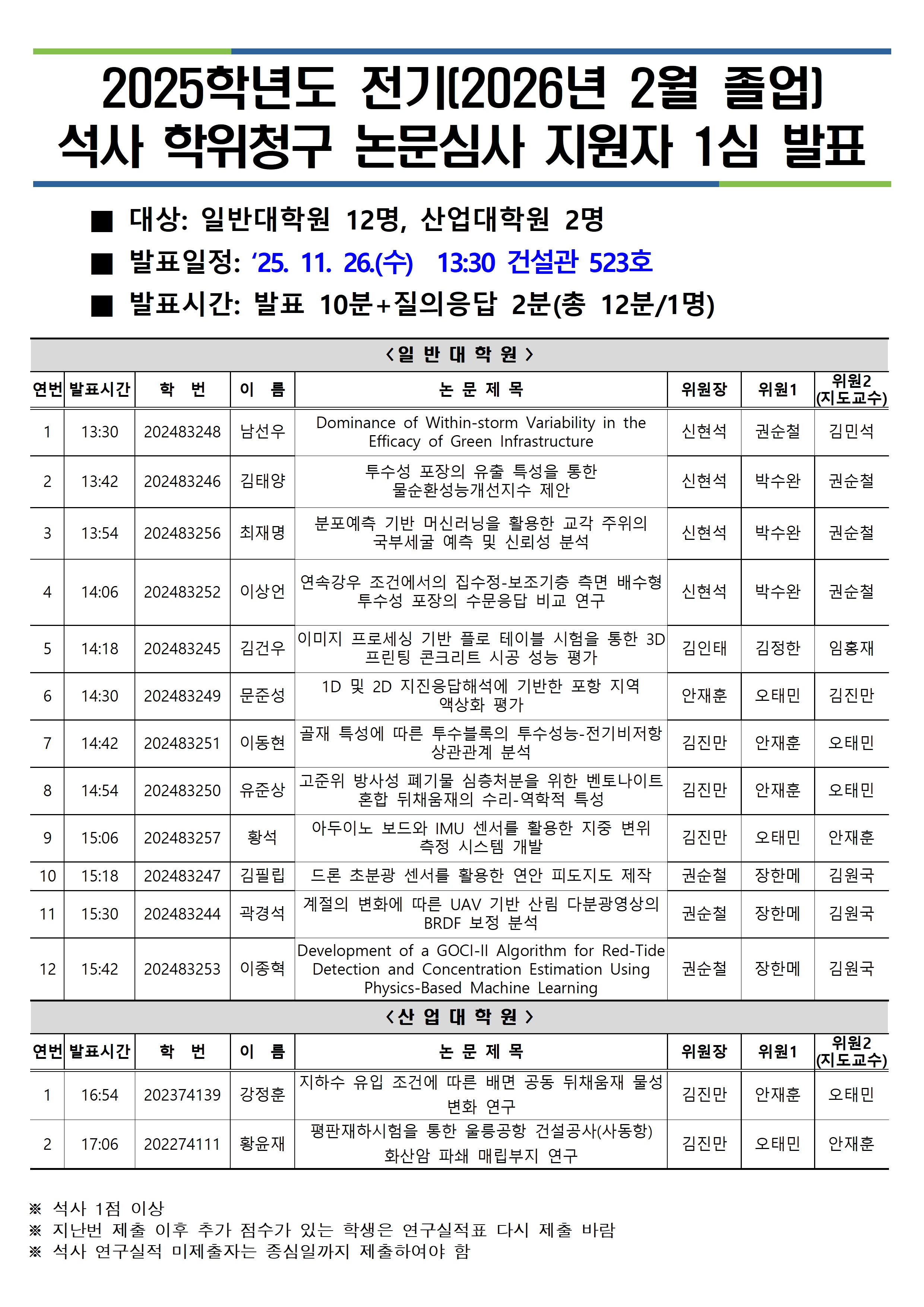 [2025학년도 2학기] 2025학년도 전기('26년 2월 졸업) 석사 학위청구논문 1심 발표 안내