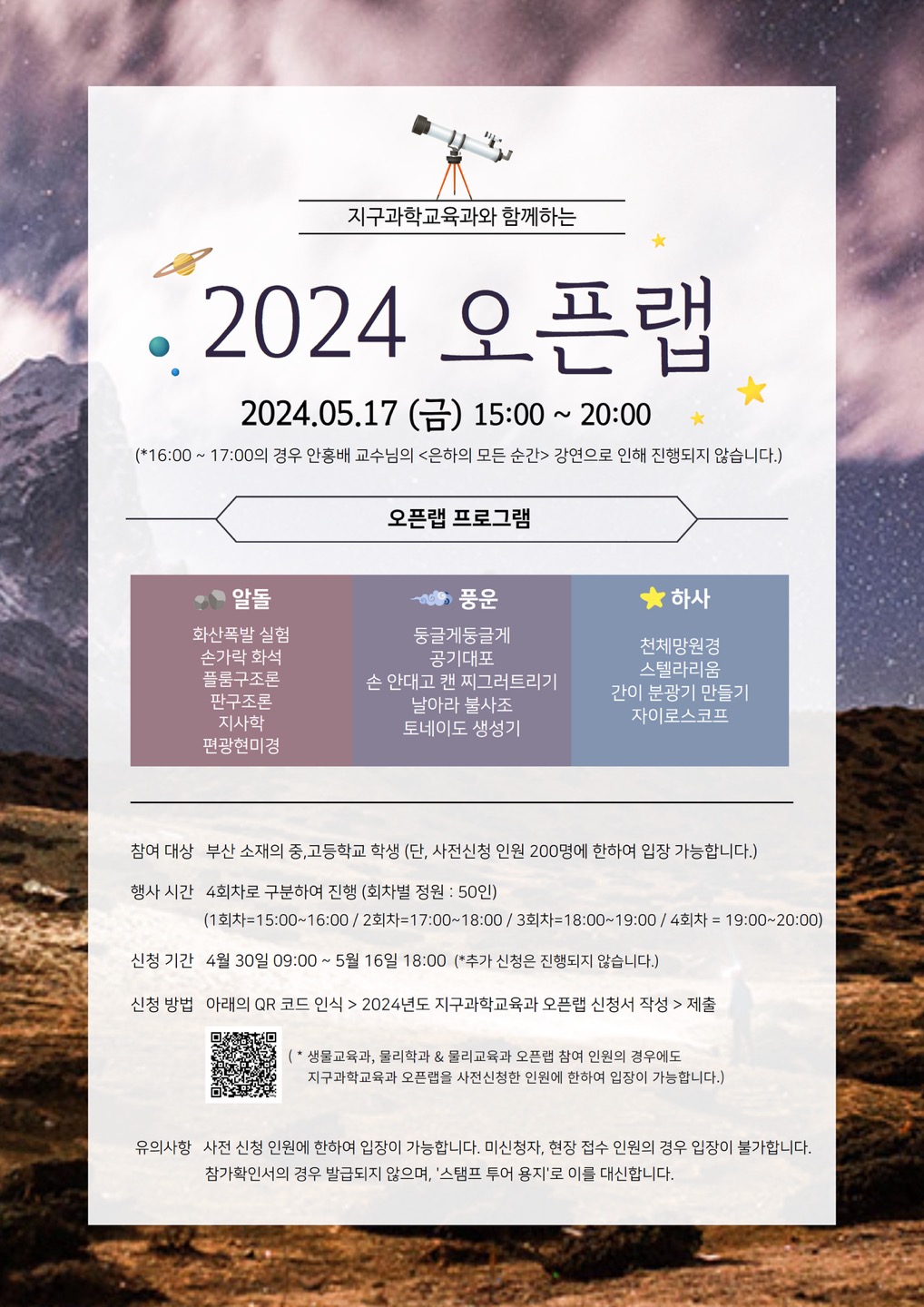 fnctId=bbs,fnctNo=4654 작성일 2024.05.02 수정일 2024.05.02 작성자 최주희 조회수 230 ‘지구과학교육과와 함께하는 2024 오픈랩’ 및 ‘대중강연 <은하의 모든 순간>’ 안내 첨부파일 첨부파일이(가) 없습니다.