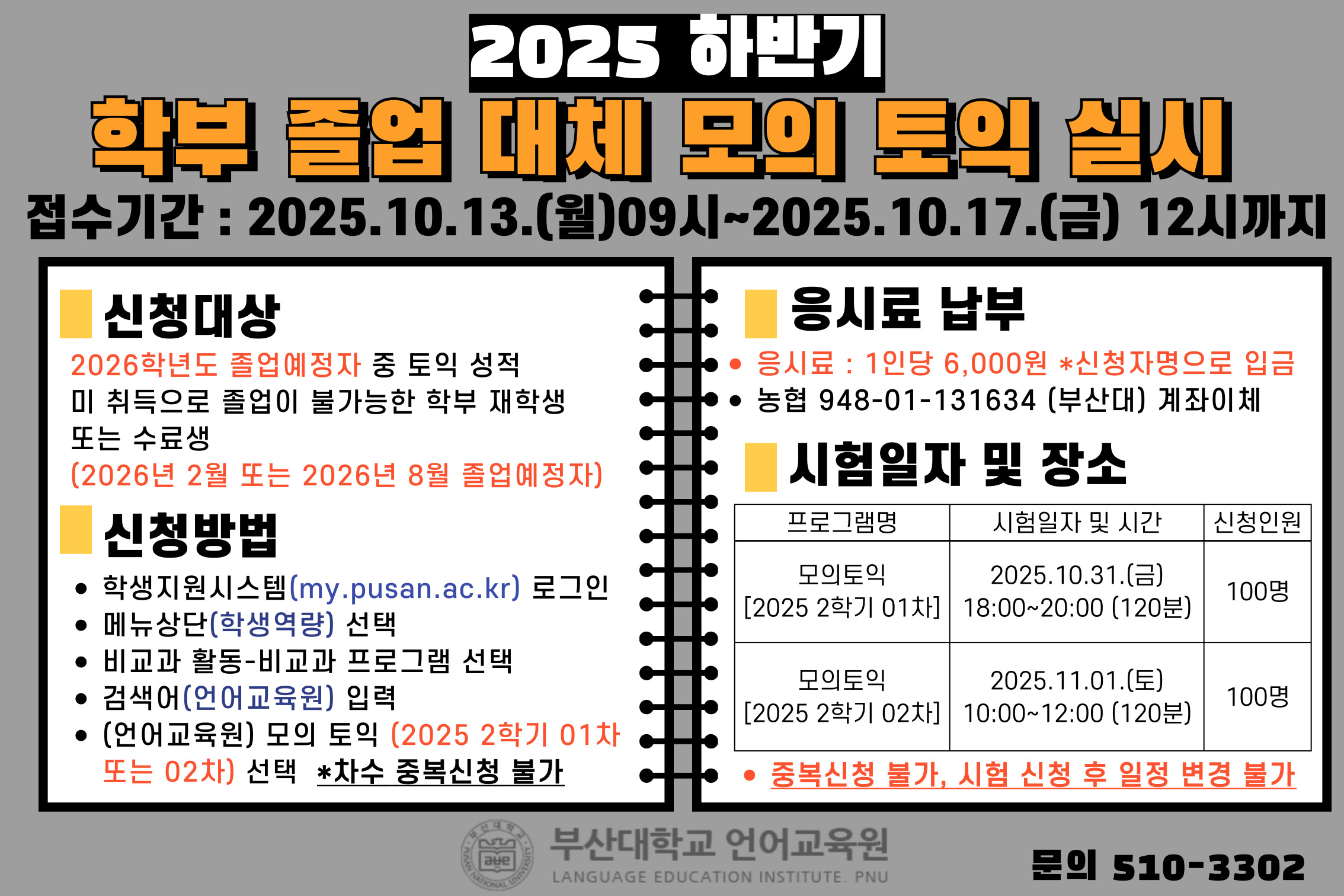 fnctId=bbs,fnctNo=4654 작성일 2025.09.22 수정일 2025.09.22 작성자 최주희 조회수 21 2025학년도 하반기 학부 졸업 대체 모의 토익 실시 안내 첨부파일 2025학년도 하반기 학부 졸업 대체 모의 토익 실시 안내(웹포스터).jpg 미리보기