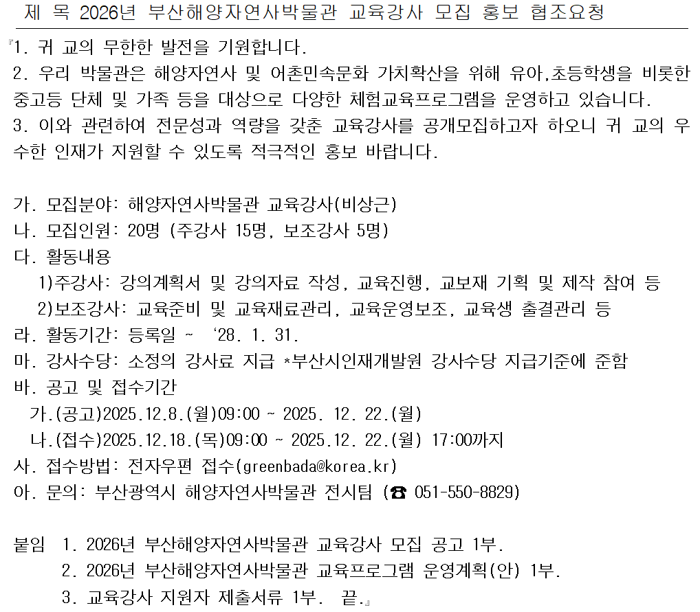fnctId=bbs,fnctNo=4690 작성일 2025.12.09 수정일 2025.12.09 작성자 최주희 조회수 15 2026년 부산해양자연사박물관 교육강사 모집 공고 첨부파일 2026년 부산해양자연사박물관 교육강사 모집 공고.pdf 미리보기