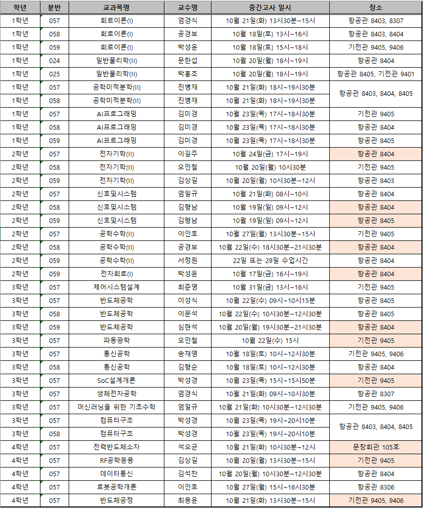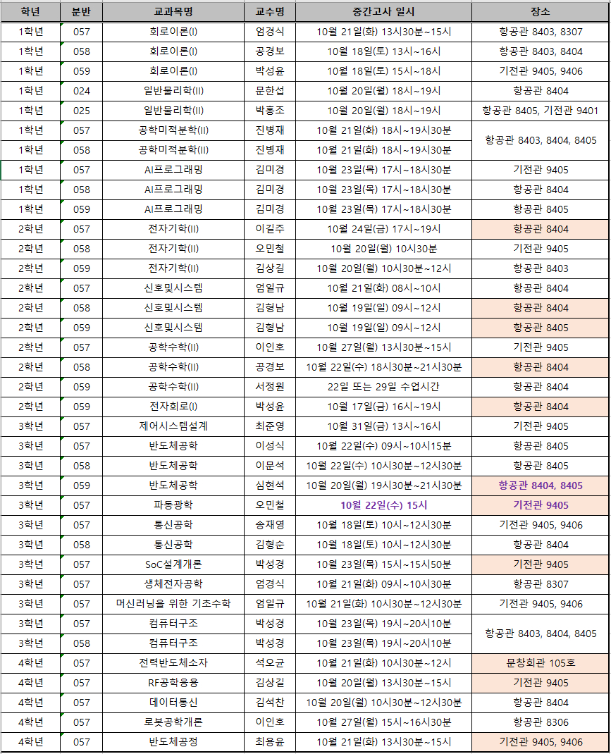 [수업] 전공과목 중간고사 일정 및 장소 알림(최초 공지 후 업데이트 될 수 있음)