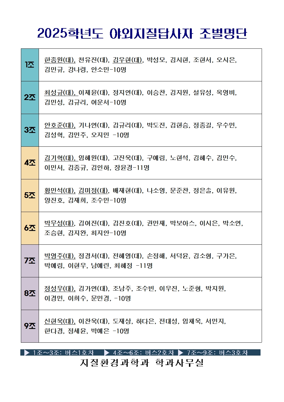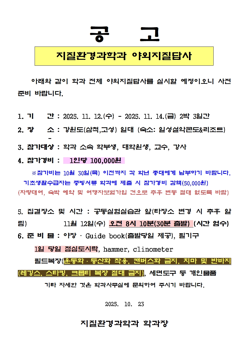 2025학년도 지질환경과학과 전체야외학술답사 일정- 추가 안내