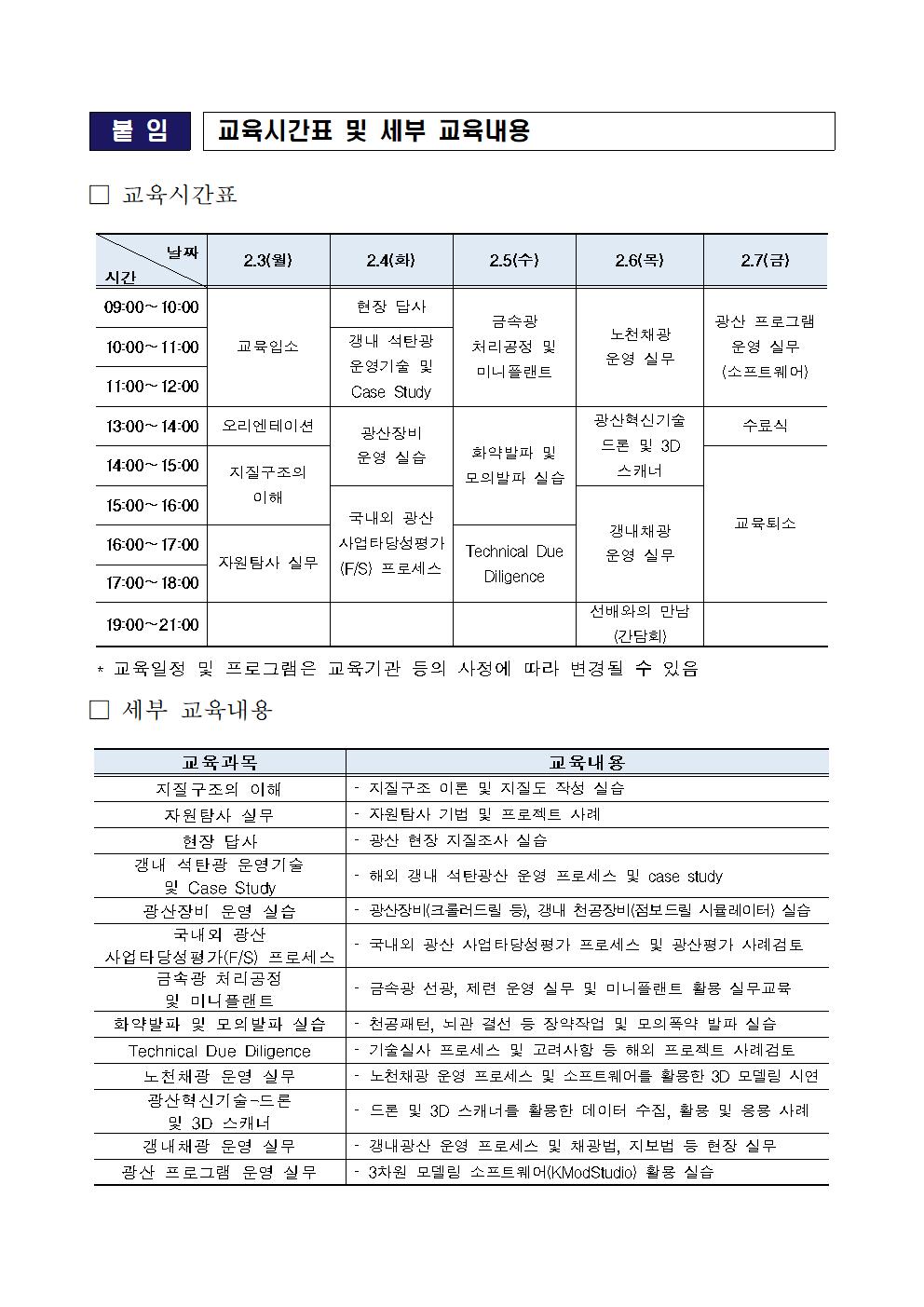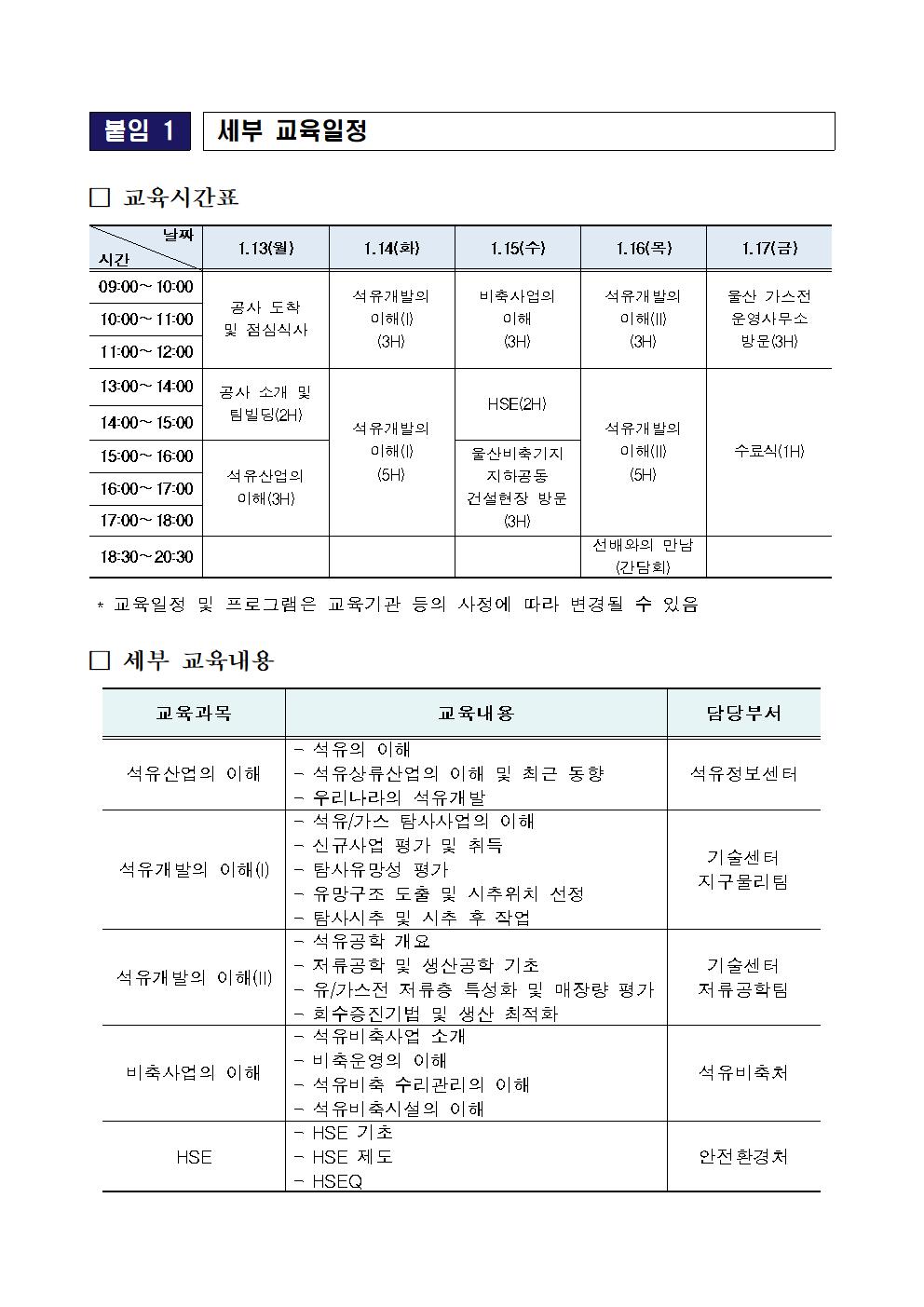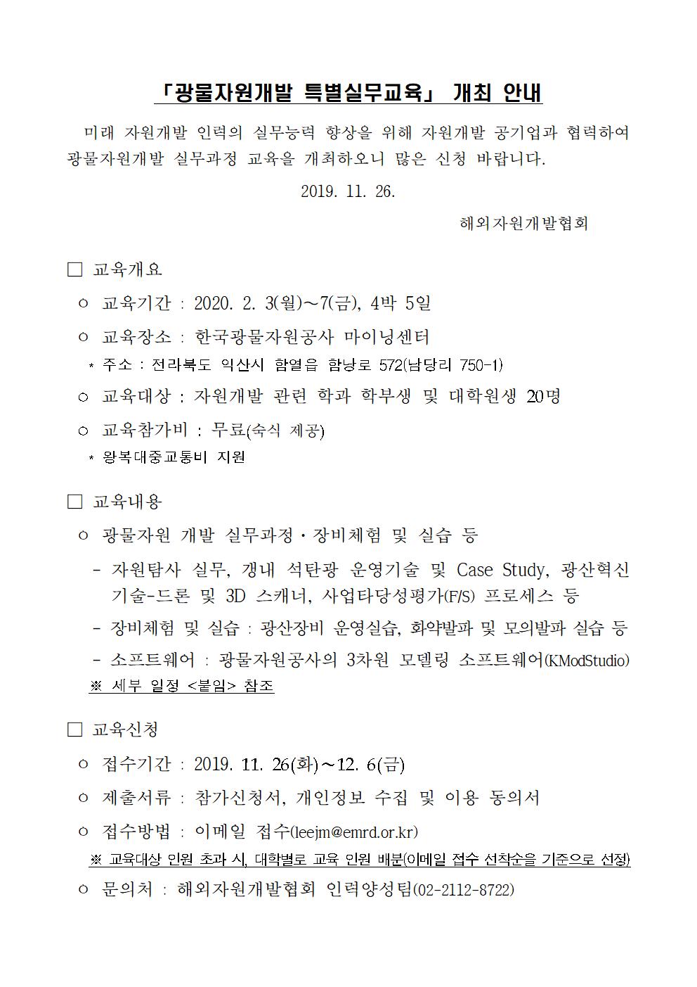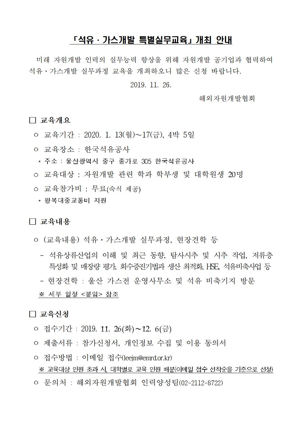 fnctId=bbs,fnctNo=2813 작성일 2019.11.27 수정일 2019.11.27 작성자 장주연 조회수 1325 해외자원개발 특별실무교육 참가학생모집(석유,가스개발 분야 / 광물자원개발분야 ) go 첨부파일 (첨부1) 실무교육 참가신청서.hwp 미리보기 (첨부2) 개인정보 수집 및 이용 동의서.hwp 미리보기