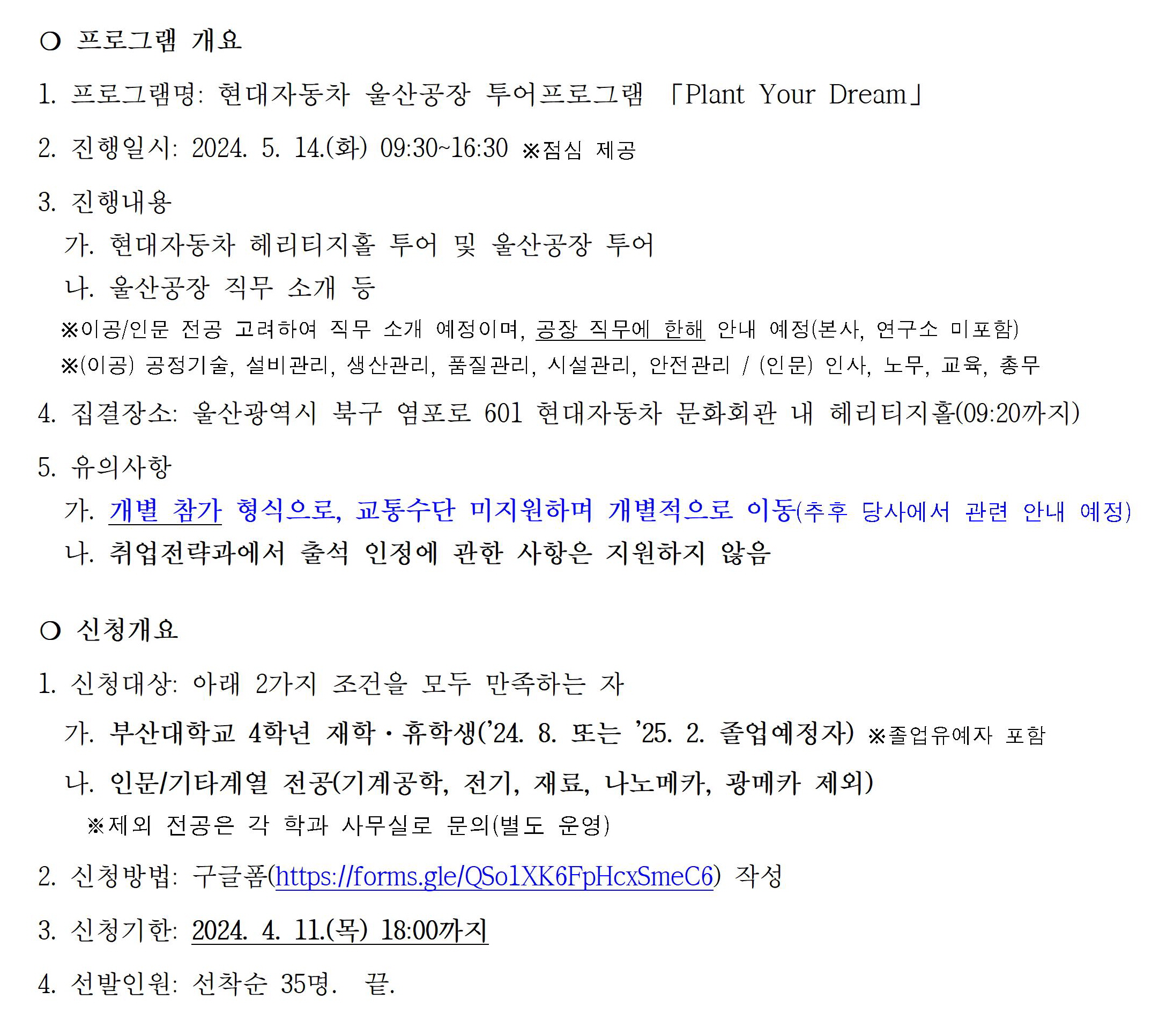 fnctId=bbs,fnctNo=3466 작성일 2024.04.08 수정일 2024.04.08 작성자 사학과 조회수 63 [취업정보] 현대자동차 울산공장 투어프로그램 「Plant Your Dream」 신청 안내 첨부파일 첨부파일이(가) 없습니다.