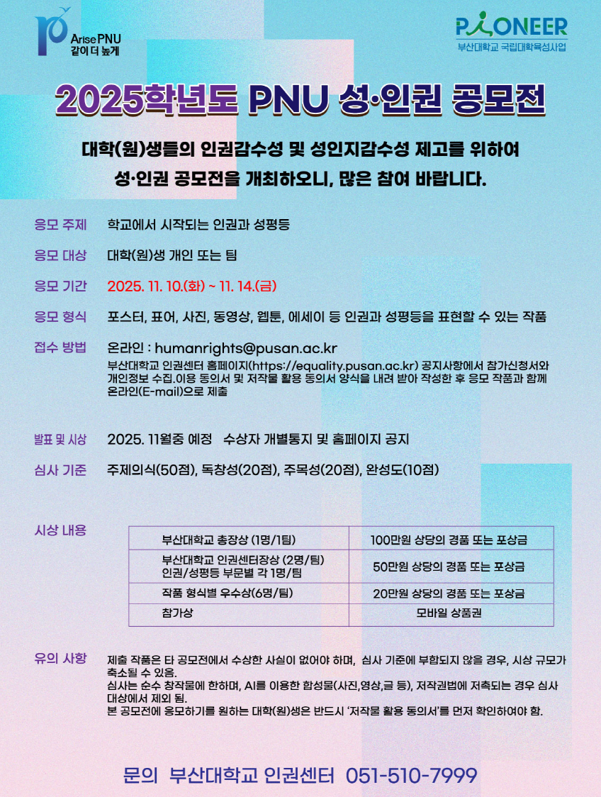 fnctId=bbs,fnctNo=3810 2025학년도 PNU 성.인권 공모전 date 2025.11.14 name 산업공학과 e-mail view 29 첨부파일 신청서,개인정보 수집?이용 동의서,저작물 활용 동의서.hwp 미리보기 포스터.jpg 미리보기