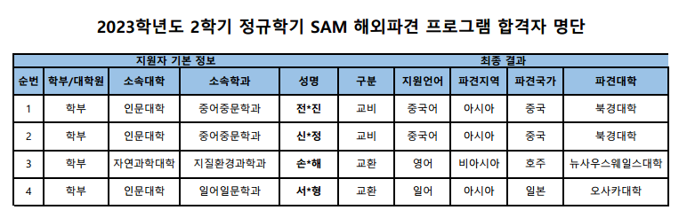 2023학년도 1학기 정규학기 SAM 해외파견 프로그램 합격자를 아래와 같이 알려드립니다.