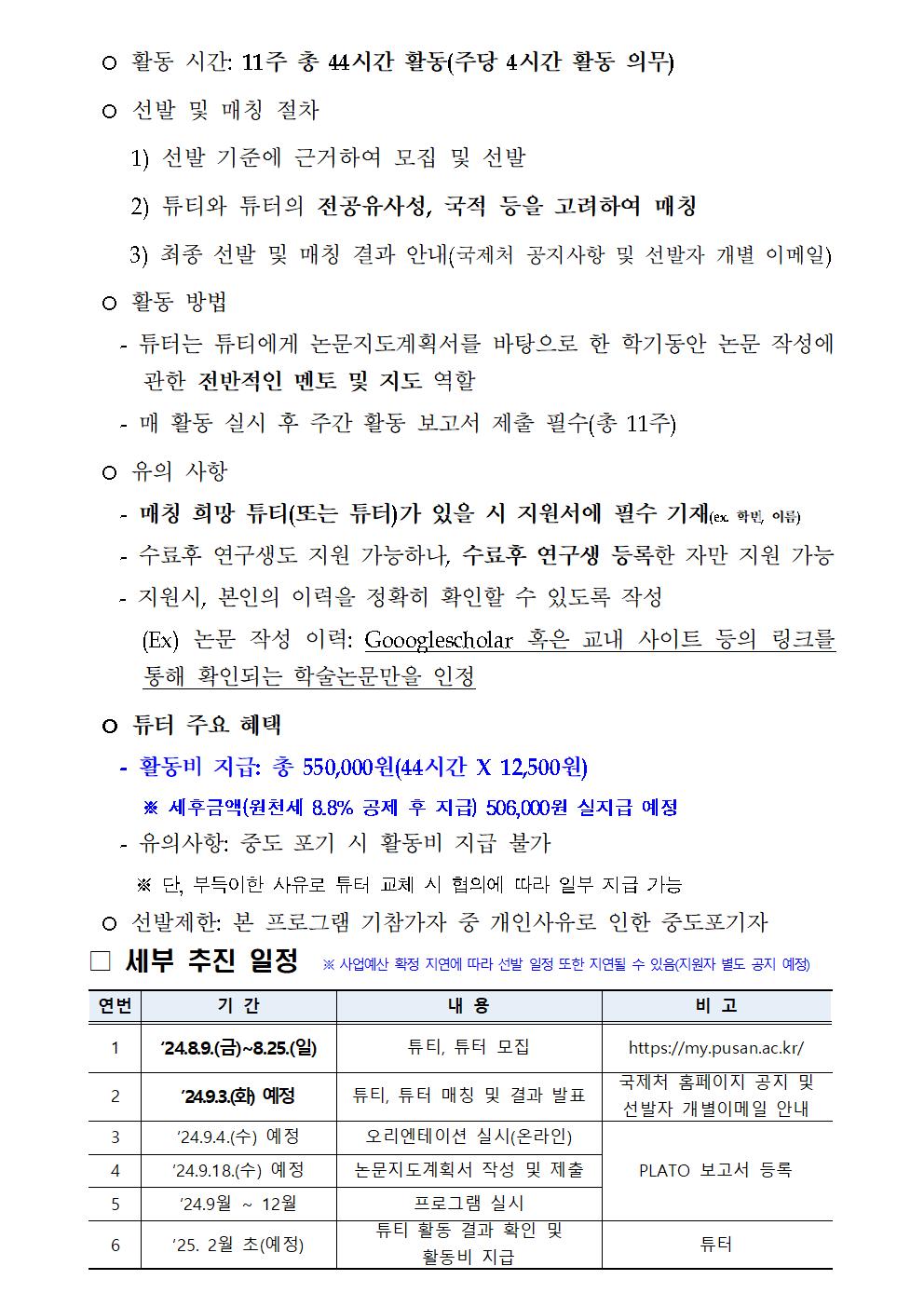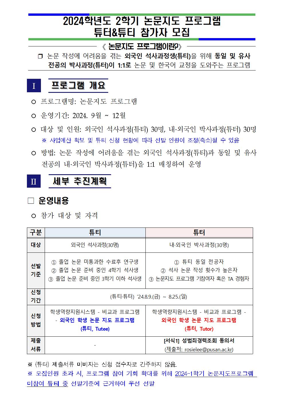 fnctId=bbs,fnctNo=2629 [홍보] 2024학년도 2학기 논문지도 프로그램 참가자 모집(튜터, 튜티) date 2024.08.06 name 이연주 e-mail view 293 첨부파일 모집공고 KOR.pdf 미리보기 모집공고 ENG.pdf 미리보기 [FORM1, 별지 제10호서식] 성범죄 경력 조회 동의서(아동ㆍ청소년의 성보호에 관한 법률 시행규칙).hwp 미리보기