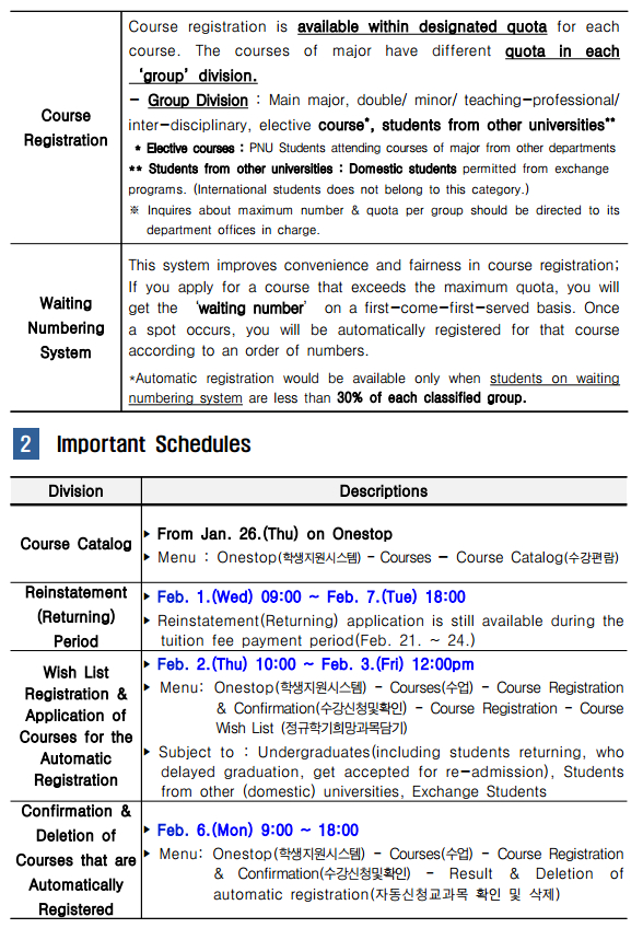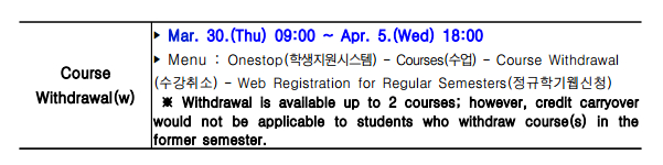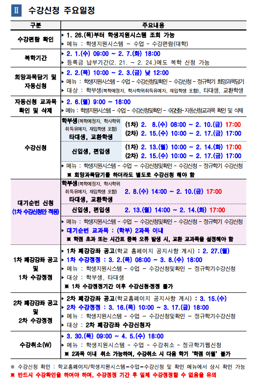 * 수강신청 제한 사항은 수강편람에서 교과목의 이름을 클릭하면 확인할 수 있습니다. (팝업으로 안내문이 나옵니다.)