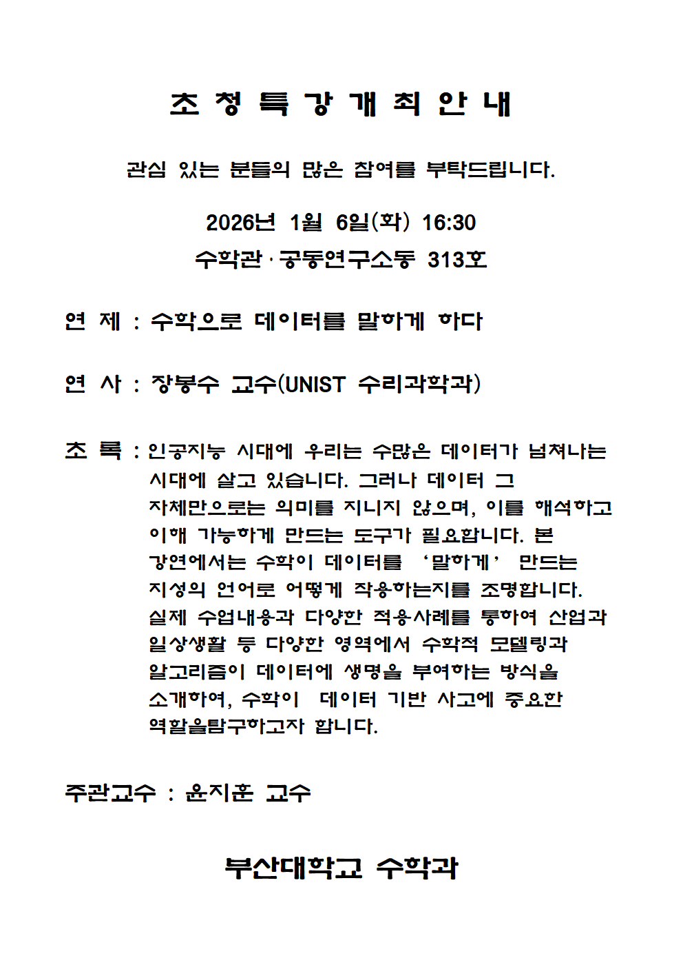 fnctId=bbs,fnctNo=2820 작성일 2026.01.05 수정일 2026.01.05 작성자 수학과 조회수 24 초청특강 (장봉수 교수) (1월 6일) 첨부파일 첨부파일이(가) 없습니다.