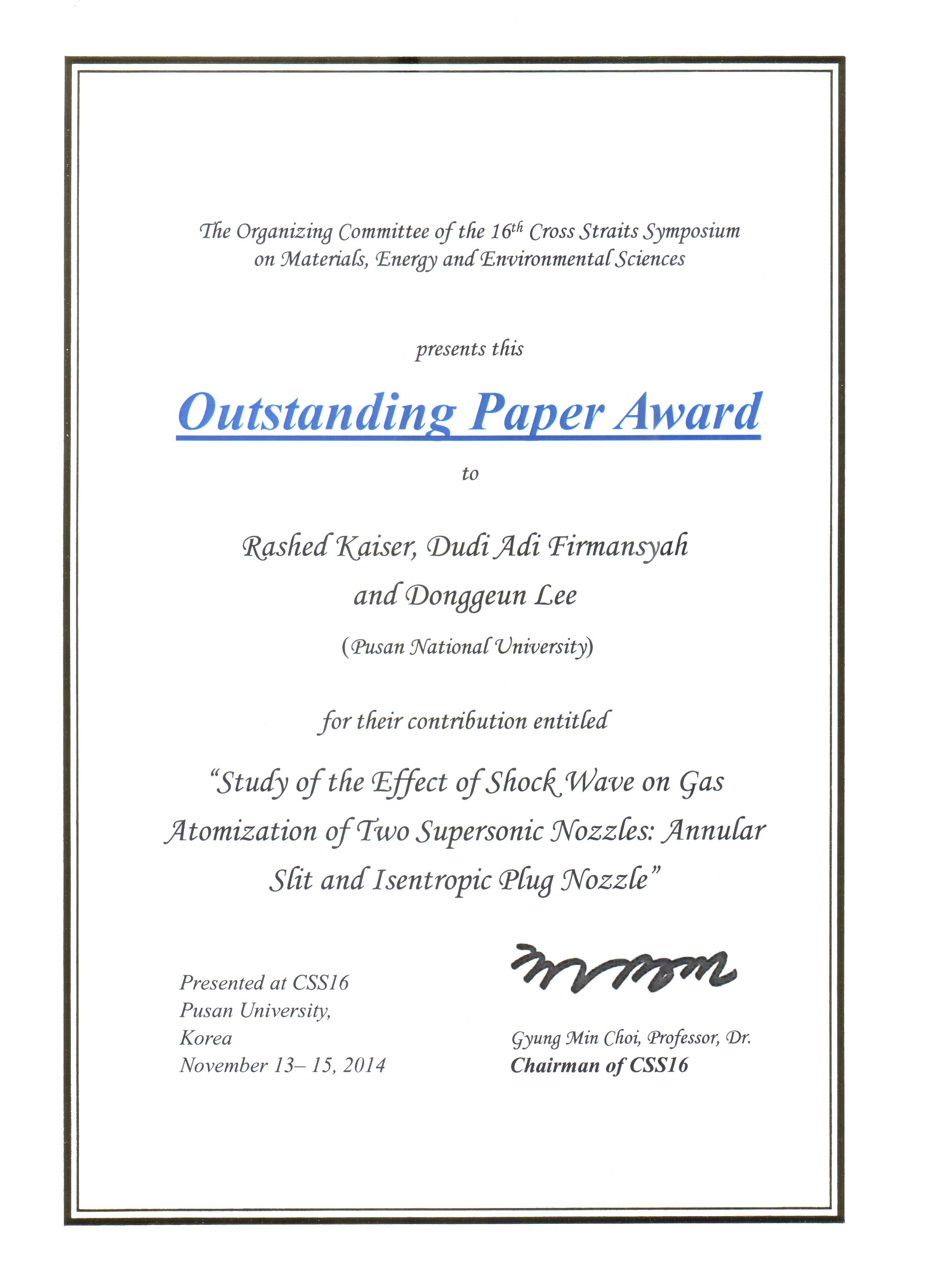 | 2014.11.13 | OutstandingPaper Award in 16th Cross Straits Symposium w/ R. Kaiser, D.A. Firmansyah |