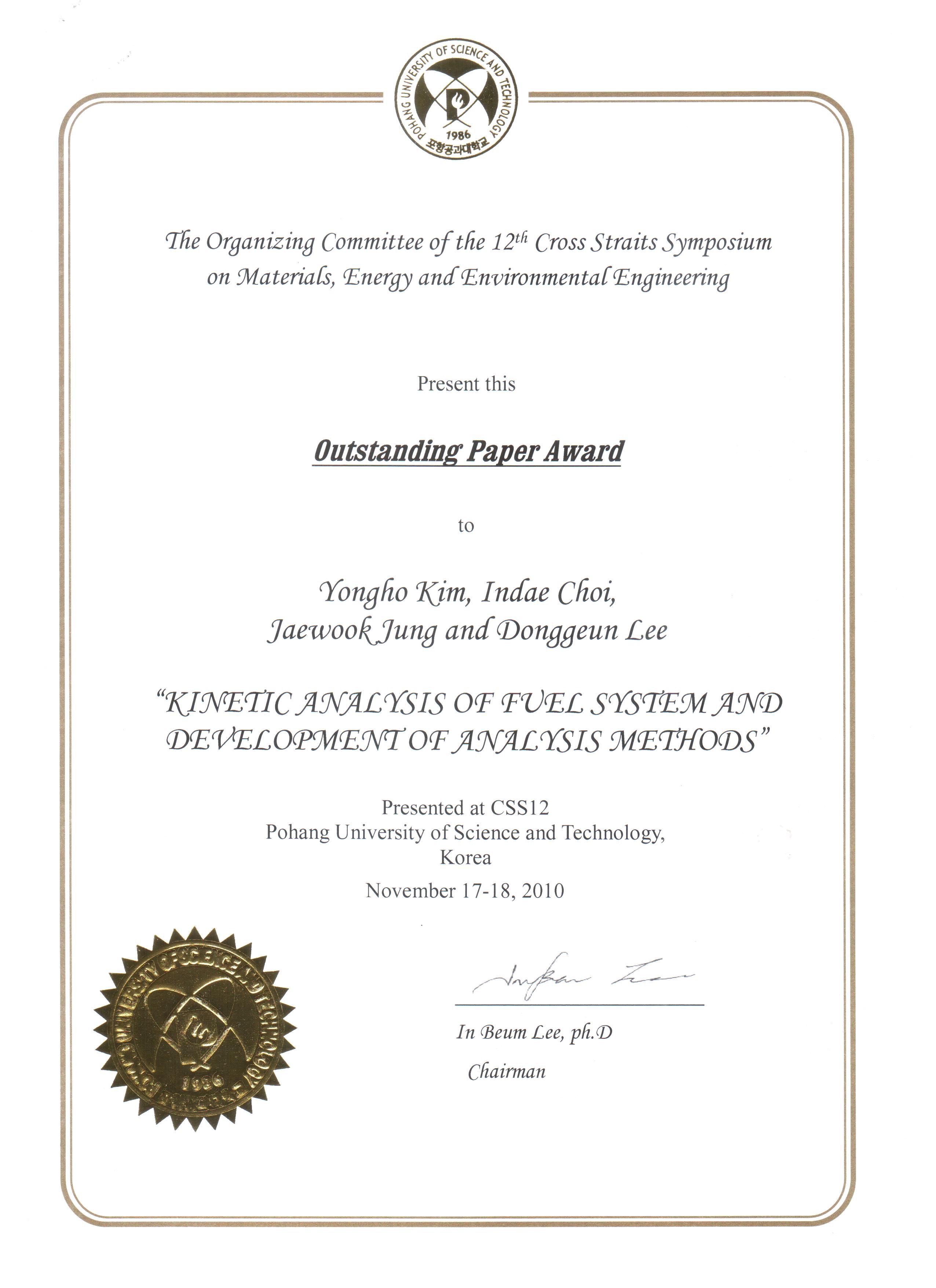| 2010.11.18 | Outstanding paper award in 2010, 12th Cross Straits Symposium |