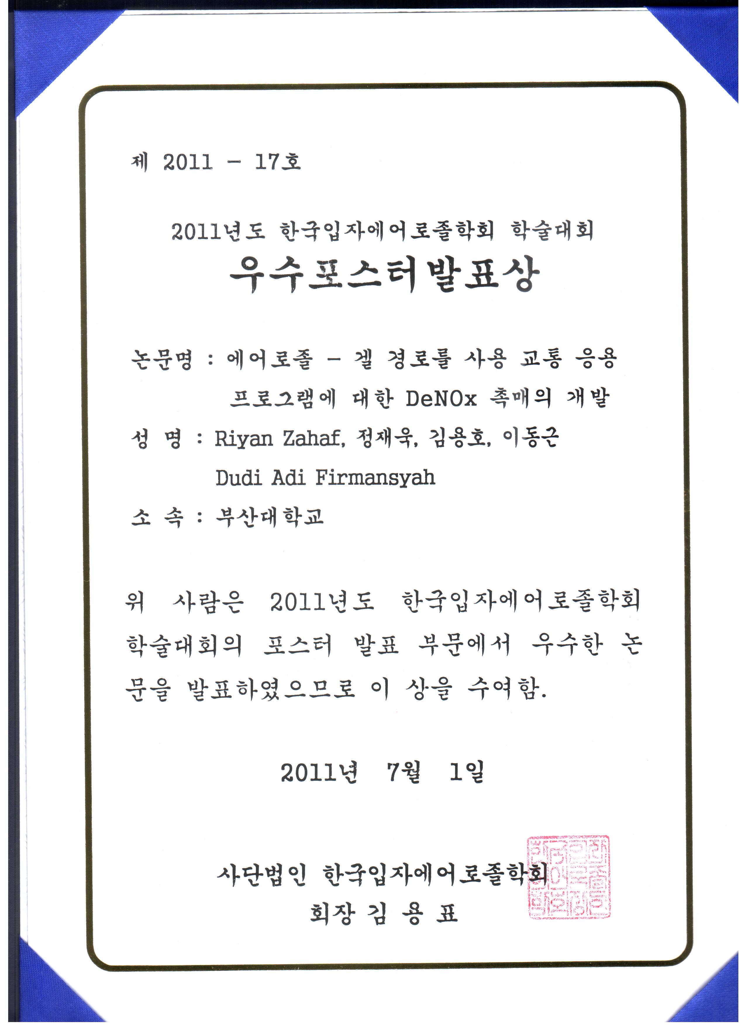 | 2011.07.01 | Best Poster Presentation Award in 2011, Korean Association for Particle and Aerosol Research |