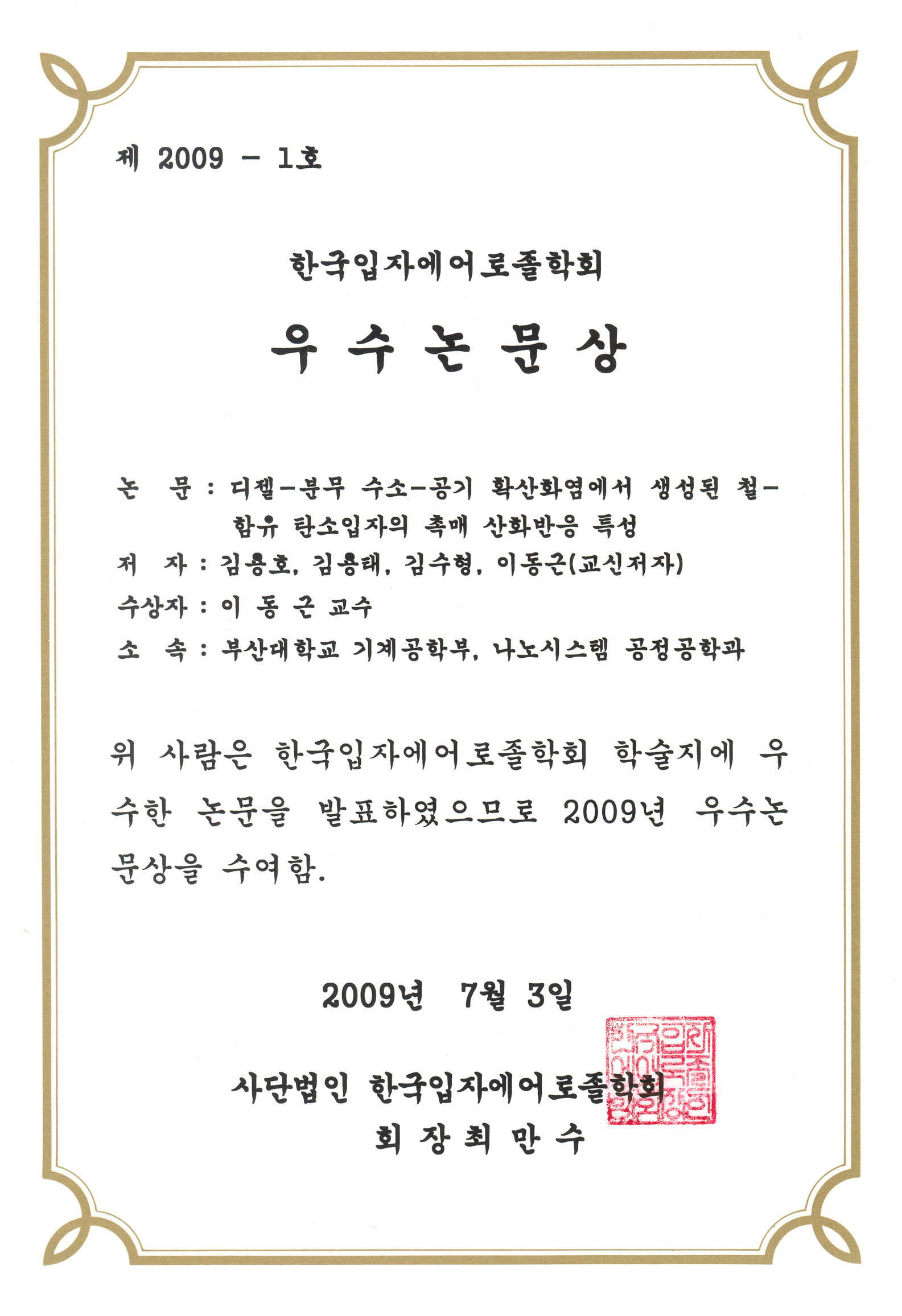 | 2009.07.02 | Best Paper Award in 2008, Korean Association for Particle and Aerosol Research |