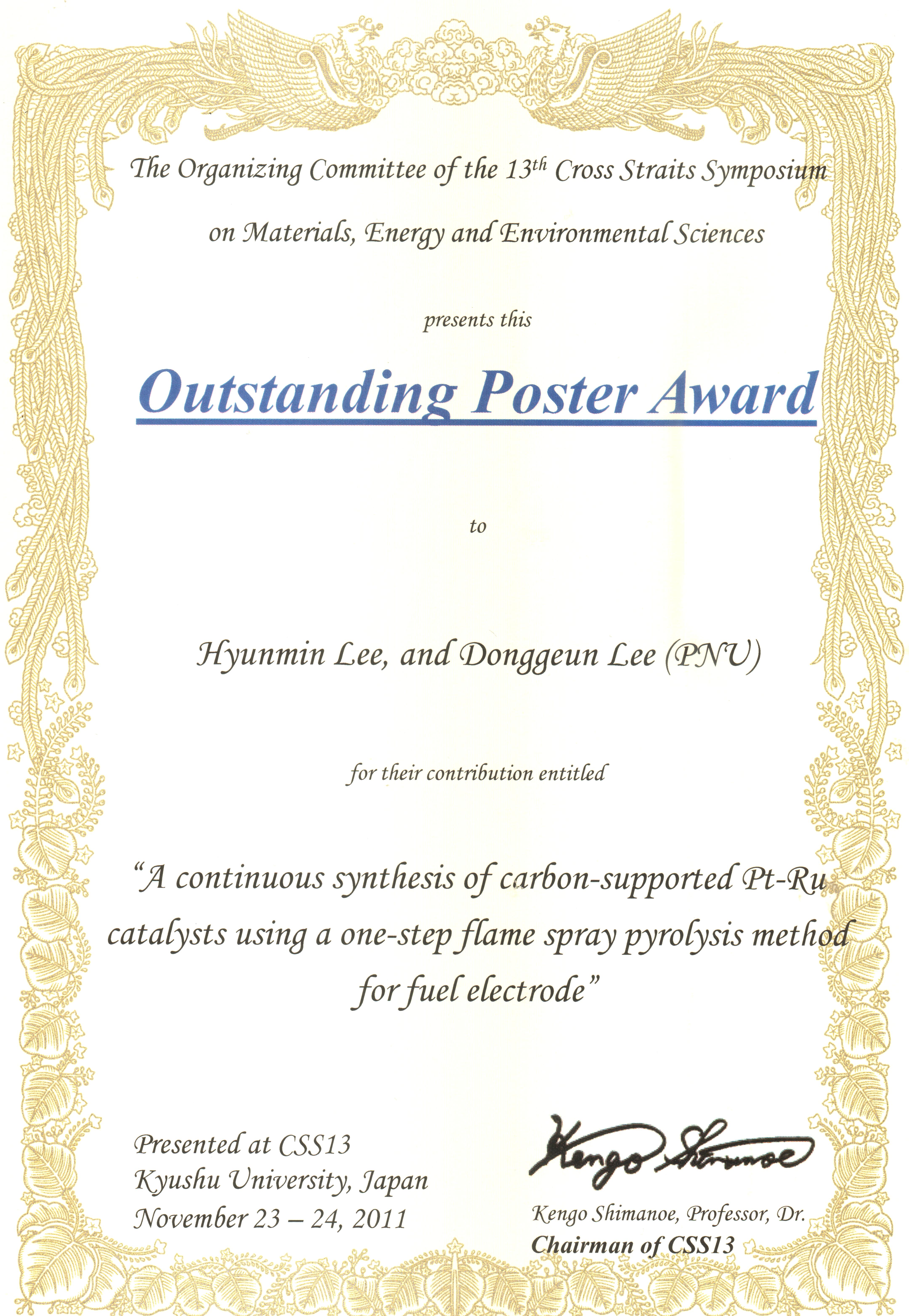 | 2011.11.23 | OutstandingPosterAward in 13th Cross Straits Symposium |