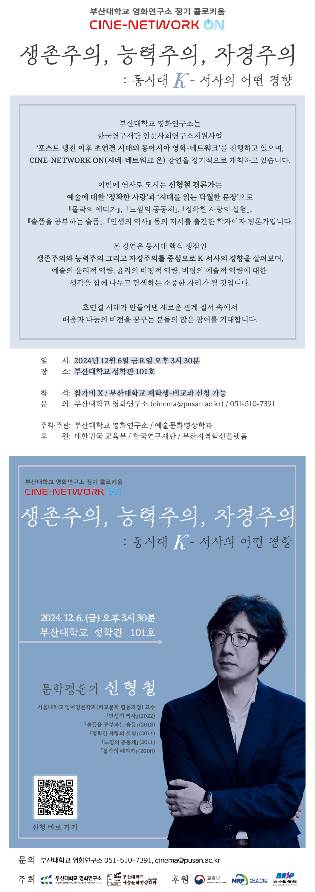 fnctId=bbs,fnctNo=6778 작성일 2024.11.01 수정일 2024.11.01 작성자 강지원 조회수 174 [CINE-NETWORK ON] 생존주의, 능력주의, 자경주의: 동시대 K-서사의 어떤 경향 첨부파일 첨부파일이(가) 없습니다.