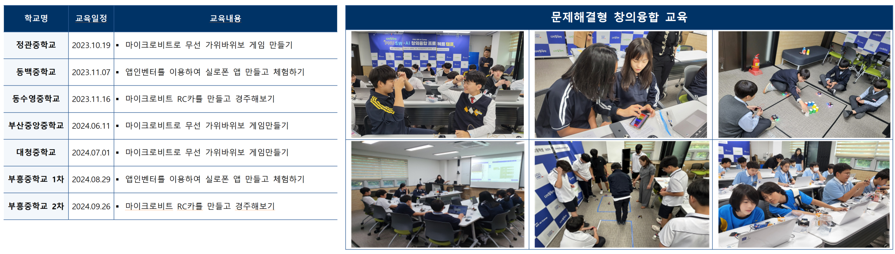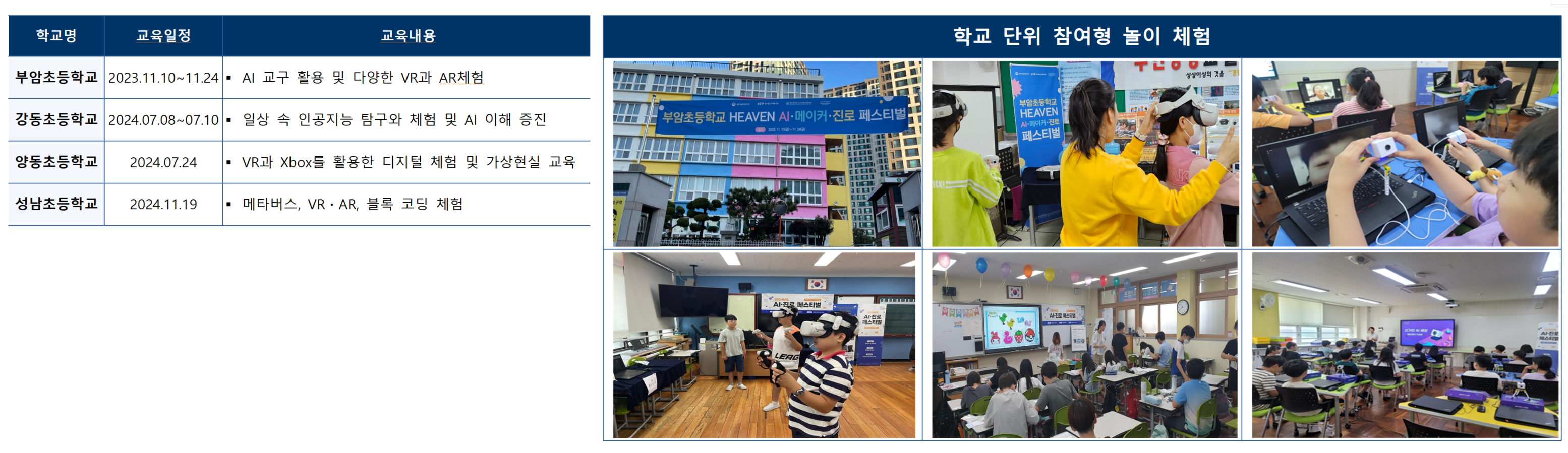 - (문제해결 역량을 갖춘 창의적 미래 인재 양성) 방과후 교육과 동아리 활동을 통해 학생들에게 다양한 실습형 체험 기회를 제공하여 학생들의 미래 진로 탐색을 지원하고, SW‧AI 소양 및 융복합 역량을 강화